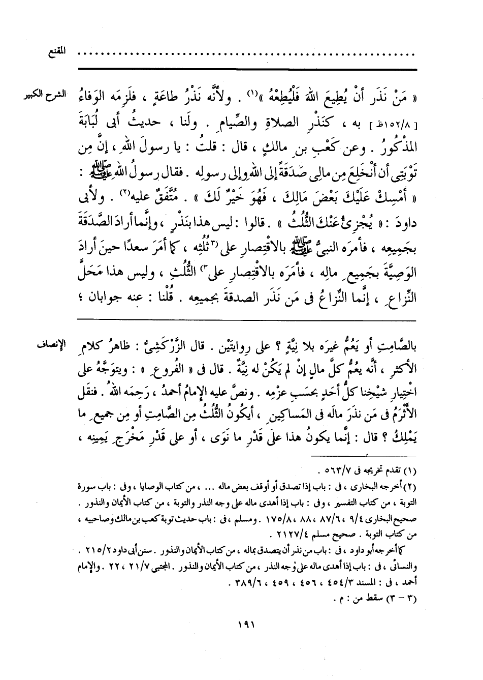 بالصَّامِتِ أو يَعُمُّ غيرَه بلا نِيَّةٍ؟ على رِوايتَين. قال الزَّرْكَشِيُّ: ظاهرُ كلامِ الأكثرِ، أنَّه يعُمُّ كلَّ مالٍ إنْ لم يَكُنْ له نِيَّةٌ. قال في «الفُروعِ»: ويتوَجَّهُ على اخْتِيارِ شيخِنا كلُّ أحَدٍ بحسَبِ عزْمِه. ونصَّ عليه الإمامُ أحمدُ، رَحِمَه اللهُ. فنقَل الأثْرَمُ في مَن نذَرَ ماله في المَساكِينِ، أيكُونُ الثُّلُثُ مِن الصَّامِتِ أو مِن جميع ما يَمْلِكُ؟ قال: إنَّما يكونُ هذا علَى قَدْرِ ما نَوَى، أو على قَدْرِ مَخرَجِ يَمِينِه،