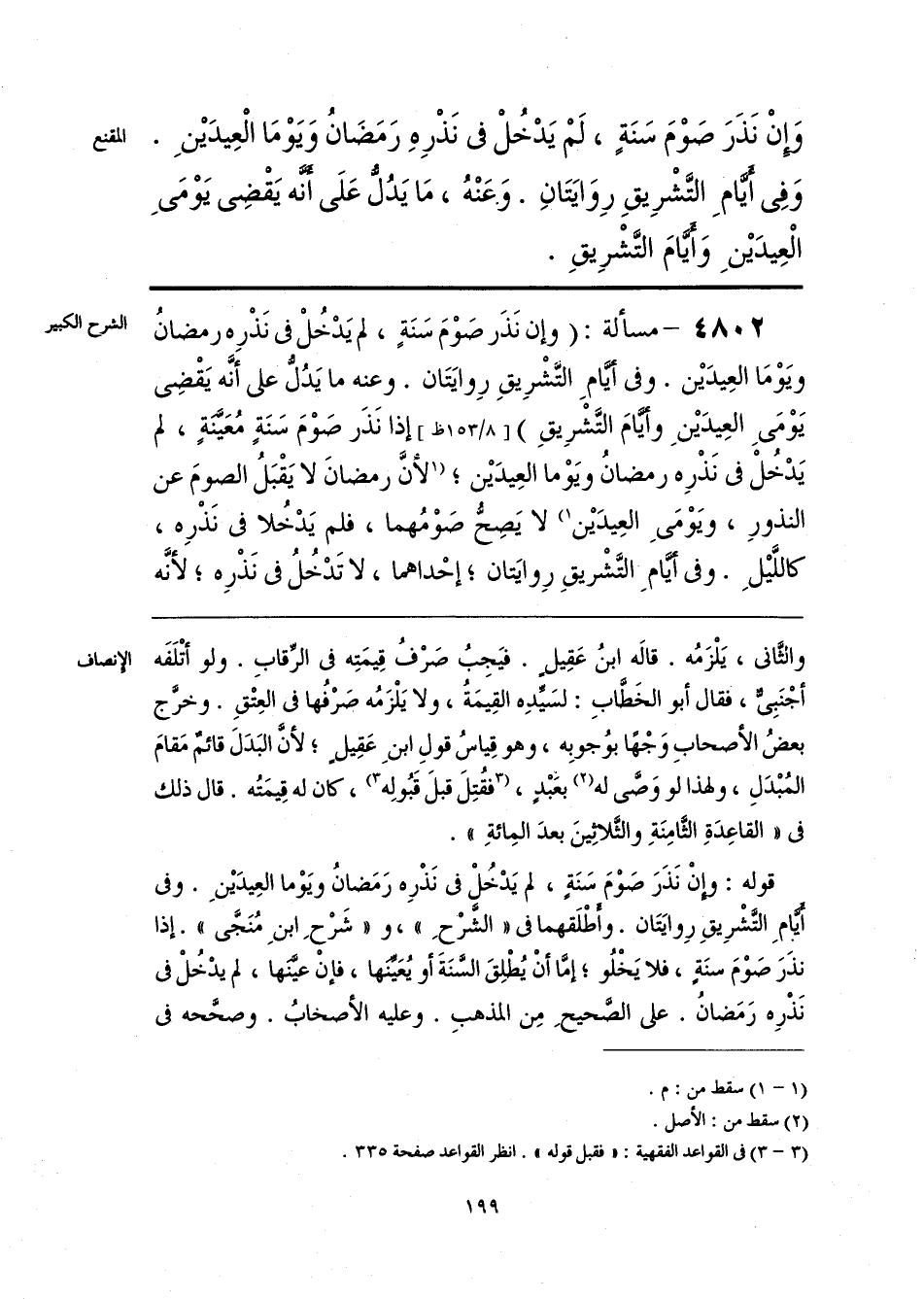 قوله: وإنْ نَذَرَ صَوْمَ سَنَةٍ، لم يَدْخلْ في نَذْرِه رَمَضانُ ويَوْما العِيدَينِ. وفي أيَّامِ التَّشْرِيقِ رِوايَتَان. واطْلَقهما في «الشَّرْحِ»، و «شَرْحِ ابنِ مُنَجَّى». إذا نذَرَ صَوْمَ سنَةٍ، فلا يَخْلُو؛ إمَّا أنْ يُطْلِقَ السَّنَةَ أو يُعَيِّنها، فإن عيَّنَها، لم يدْخُلْ في نَذْرِه رَمَضانُ. على الصَّحيحِ مِن المذهبِ. وعليه الأصحابُ. وصحَّحه في