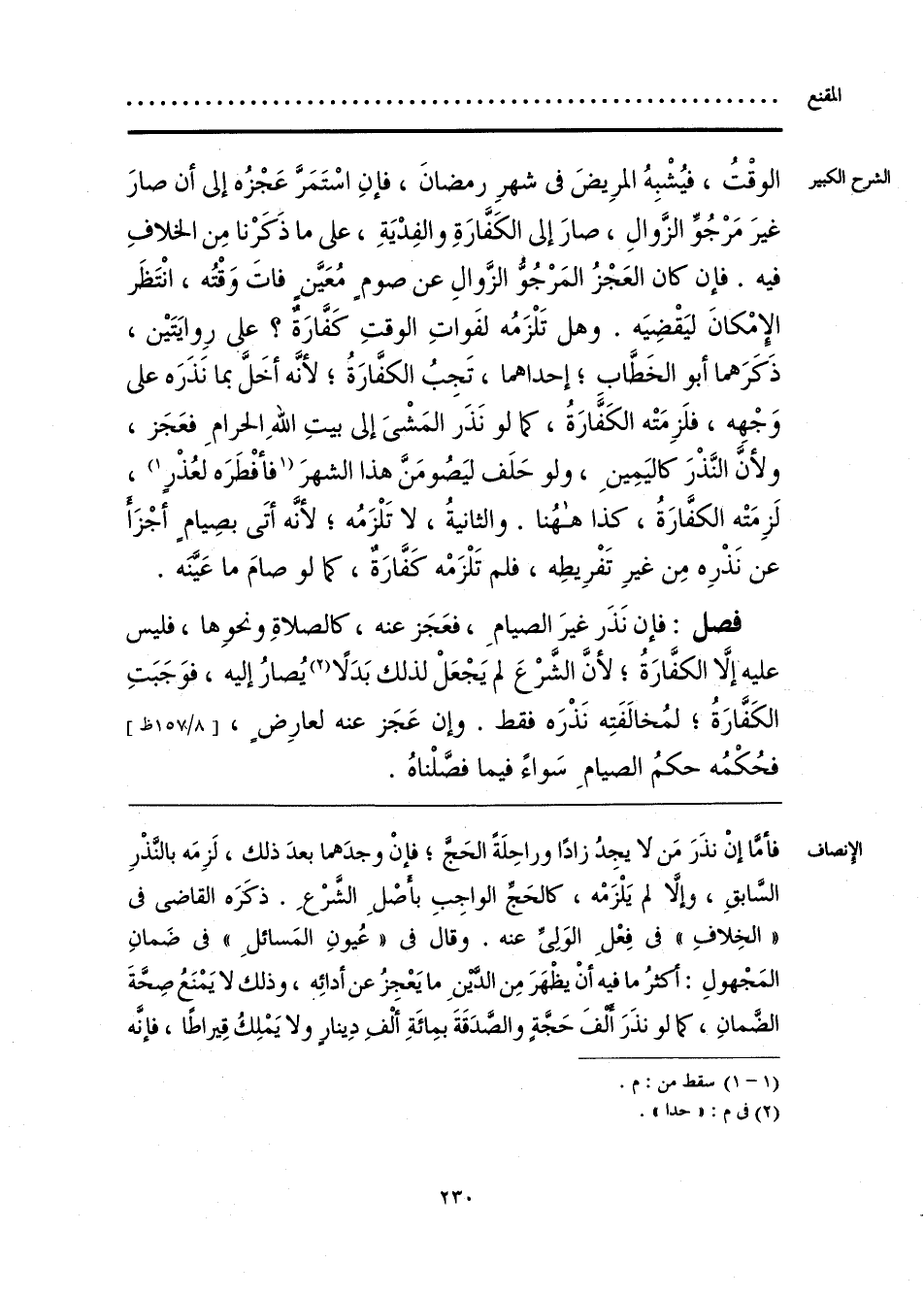 فأمَّا إنْ نذَرَ مَن لا يجِدُ زادًا وراحِلَةً الحَجَّ؛ فإن وجدَهما بعدَ ذلك، لَزِمَه بالنَّذْرِ السَّابقِ، وإلَّا لم يَلْزَمْه، كالحَجِّ الواجِبِ بأصْلِ الشَّرْعِ. ذكَرَه القاضي في «الخِلافِ» في فِعْلِ الوَلِي عنه. وقال في «عُيونِ المَسائلِ» في ضَمانِ المَجْهولِ: أكثرُ ما فيه أن يظْهَرَ مِن الدَّينِ ما يَعْجزُ عن أدائِه، وذلك لا يَمْنَعُ صِحَّةَ الضَّمانِ، كما لو نذَرَ ألفَ حَجَّةٍ والصَّدَقةَ بمِائَةِ أَلْفِ دِينارٍ ولا يَمْلِكُ قِيراطًا، فإنَّه