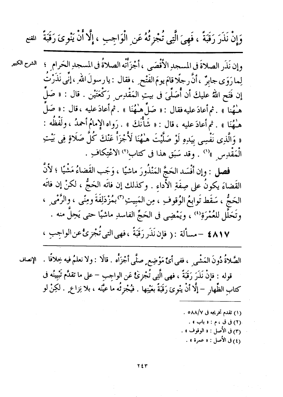 الصَّلاةُ دُونَ المَشْي، ففي أيِّ مَوْضِعٍ صلَّى أجْزَأه. قالا: ولا نعلمُ فيه خِلافًا. قوله: فإن نَذَرَ رَقَبَةً، فهي الَّتِي تُجْزِئ عَن الواجِبِ -على ما تقدَّم تَبْيِينُه في كتابِ الظِّهارِ- إلَّا أن ينْويَ رَقَبَةً بعَينها. فيُجْزِئُه ما عيَّنَه، بلا نِزاعٍ. لكِنْ لو