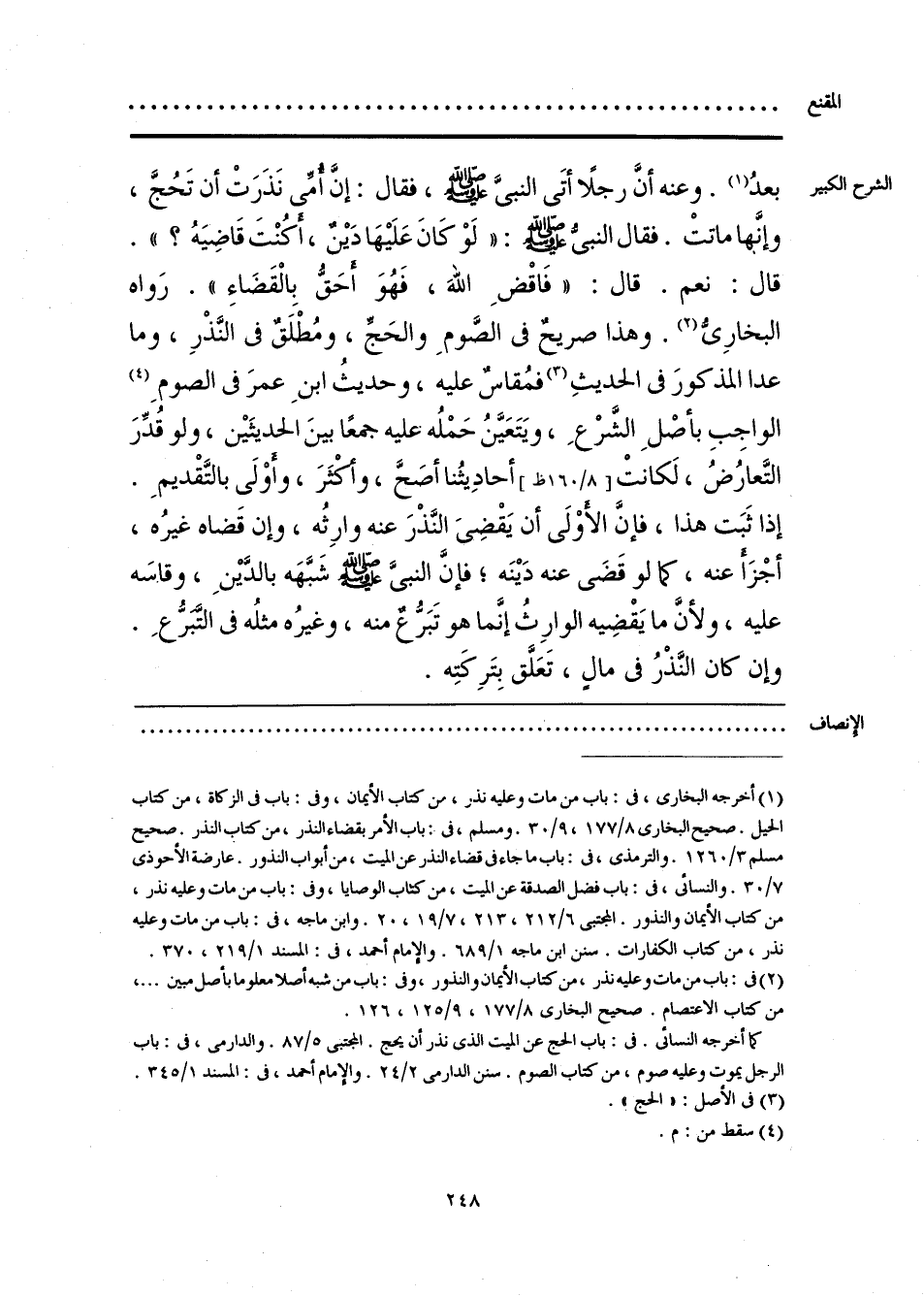 (¬1) أخرجه البُخاريّ، في: باب من مات وعليه نذر، من كتاب الإيمان، وفي: باب في الزكاة، من كتاب الحيل. صحيح البُخاريّ 8/ 177، 9/ 30. ومسلم، في: باب الأمر بقضاء المنذر، من كتاب المنذر. صحيح مسلم 3/ 1260. والترمذي، في: باب ما جاء في قضاء المنذر عن الميت، من أبواب النذور. عارضة الأحوذي 7/ 30. والنسائي، في: باب فضل الصدقة عن الميت، من كتاب الوصايا، وفي: باب من مات وعليه نذر، من كتاب الأيمان والنذور. المجتبى 6/ 212، 213، 7/ 19، 20. وابن ماجة، في: باب من مات وعليه نذر، من كتاب الكفارات. سنن ابن ماجة 1/ 689. والإمام أحمد، في: المسند 9/ 211، 370.