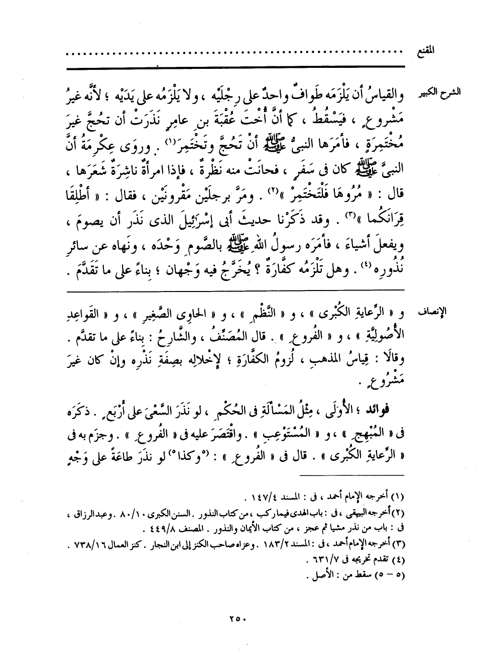 و «الرِّعايةِ الكُبْرى»، و «النَّظْمِ»، و «الحاوي الصَّغِيرِ»، و «القَواعِدِ الأصُولِيَّةِ»، و «الفُروعِ». قال المُصَنِّفُ، والشَّارِحُ: بِناءً على ما تقدَّم. وقالا: قِياسُ المذهبِ، لُزومُ الكفَّارَةِ؛ لإخْلالِه بصِفةِ نَذْرِه وإنْ كان غيرَ مَشْرُوع.
