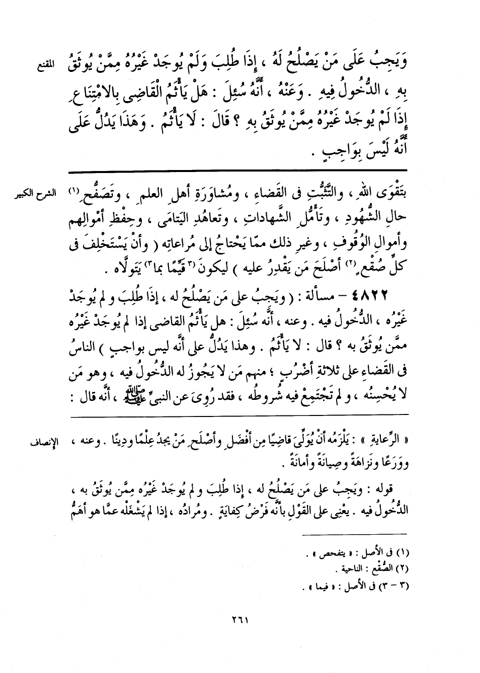 «الرِّعايةِ»: يَلْزَمُه أنْ يُوَلِّيَ قاضِيًا مِن أفْضَلِ وأصْلَحِ مَنْ يجدُ عِلْمًا ودِينًا. وعنه، ووَرَعًا ونَزاهَةً وصِيانَةً وأمانَةً.