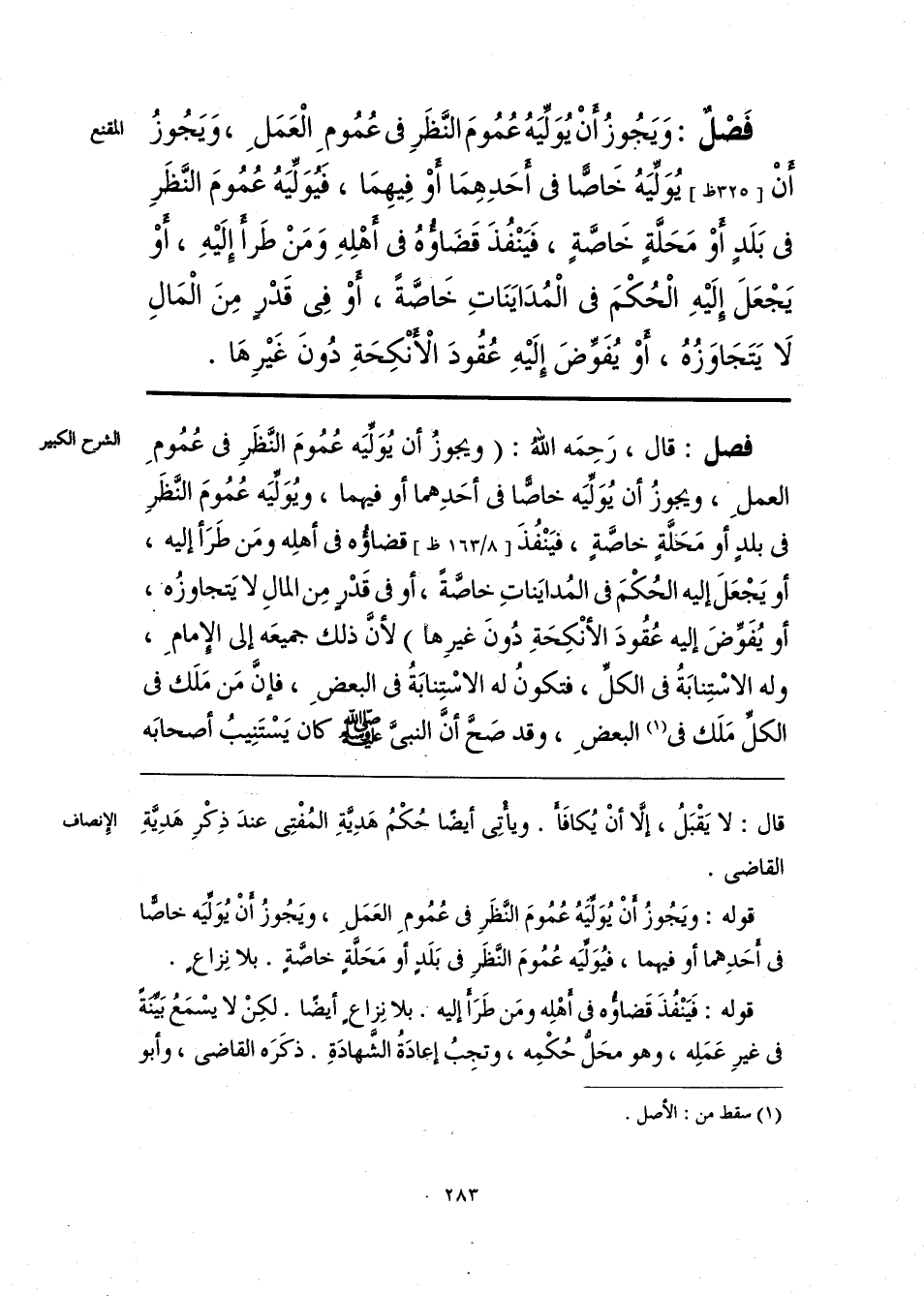 فَصْلٌ: وَيَجُوزُ أنْ يُوَلِّيَهُ عُمُومَ النَّظَرِ في عُمُومِ الْعَمَلِ، وَيَجُوزُ أَنْ يُوَلِّيَهُ خَاصًّا في أَحَدِهمَا أو فِيهِمَا، فيُوَلِّيَهُ عُمُومَ النَّظَرِ في بَلَدٍ أَوْ مَحَلَّةٍ خَاصَّةٍ، فَيَنْفُذَ قَضَاؤهُ في أَهْلِهِ وَمَنْ طَرأَ إِلَيهِ، أَوْ يَجْعَلَ إليهِ الْحُكْمَ في الْمُدَايَنَاتِ خَاصَّةً، أَوْ فِي قَدْرٍ مِنَ الْمَالِ لَا يَتَجَاوَزُهُ، أَوْ يُفَوِّضَ إِلَيهِ عُقُودَ الأَنْكِحَةِ دُونَ غَيرِهَا.