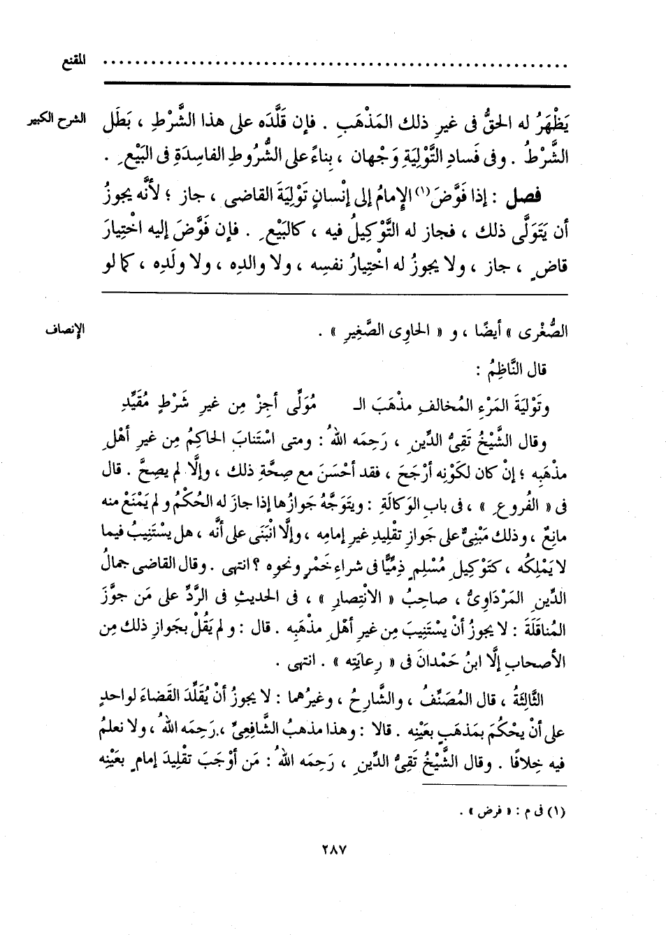 وقال الشَّيخُ تَقِيُّ الدِّينِ، رَحِمَه اللهُ: ومتى اسْتَنابَ الحاكِمُ مِن غيرِ أهْلِ مذْهَبِه؛ إنْ كان لكَوْنِه أرْجَحَ، فقد أحْسَنَ مع صِحَّةِ ذلك، وإلَّا لم يصِحَّ. قال في «الفُروعِ»، في بابِ الوَكالةِ: ويتَوَجَّهُ جَوازُها إذا جازَ له الحُكْمُ ولم يَمْنَعْ منه مانِعٌ، وذلك مَبْنِيٌّ على جَوازِ تقْلِيدِ غيرِ إمامِه، وإلَّا انْبَنَى على أنَّه، هل يسْتَنِيبُ فيما لا يَمْلِكُه، كتَوْكِيلِ مُسْلِم ذِمِّيًّا في شراءِ خَمْر ونحوه؟ انتهى. وقال القاضي جمالُ الدِّينِ المَرْدَاويُّ، صاحِبُ «الانْتِصارِ»، في الحديثِ في الرَّدِّ على مَن جوَّزَ المُناقَلَةَ: لا يجوزُ أنْ يسْتَنِيبَ مِن غيرِ أهلِ مذْهَبِه. قال: ولم يَقُلْ بجَوازِ ذلك مِن الأصحابِ إلَّا ابنُ حَمْدانَ في «رِعايَتِه». انتهى.