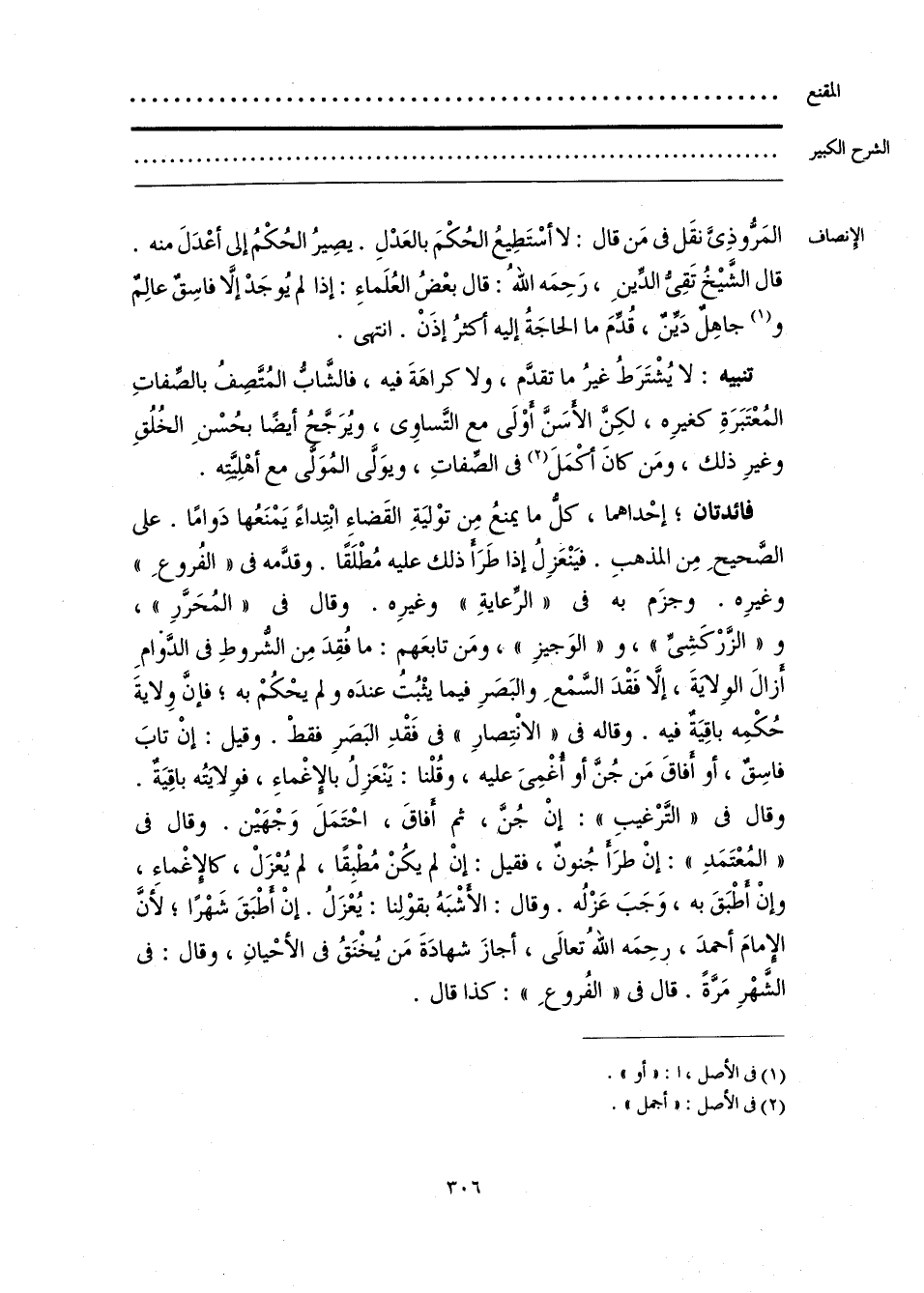 فائدتان؛ إحْداهما، كل ما يمنعُ مِن توْليَةِ القَضاءِ ابْتِداءً يَمْنَعُها دَوامًا. على الصَّحيحِ مِن المذهبِ. فيَنْعَزِلُ إذا طَرَأ ذلك عليه مُطْلَقًا. وقدَّمه في «الفُروعِ» وغيرِه. وجزَم به في «الرِّعايةِ» وغيرِه. وقال في «المُحَرَّرِ»، و «الزَّرْكَشِيِّ»، و «الوَجيزِ»، ومَن تابعَهم: ما فُقِدَ مِن الشُّروطِ في الدَّوامِ أزال الولايةَ، إلَّا فَقْدَ السَّمْعِ والبَصَرِ فيما يثْبُتُ عندَه ولم يحْكُمْ به؛ فإنَّ ولايةَ حُكْمِه باقِيَةٌ فيه. وقاله في «الانْتِصارِ» في فَقْدِ البَصَرِ فقطْ. وقيل: إنْ تابَ فاسِقٌ، أو أفاقَ مَن جُنَّ أو أُغْمِيَ عليه، وقُلْنا: يَنْعَزِلُ بالإِغْماءِ، فولايَتُه باقِيَةٌ. وقال في «التَّرْغيبِ»: إنْ جُنَّ، ثم أفاقَ، احْتَمَلَ وَجْهَين. وقال في «المُعْتَمَدِ»: إنْ طرَأ جُنون، فقيل: إنْ لم يكُنْ مُطْبقًا، لم يُعْزَلْ، كالإغْماء، وإنْ أطْبَقَ به، وَجَبَ عَزْلُه. وقال: الأثْمبَهُ بقوْلِنا: يُعْزَلُ. إنْ أطْبَقَ شَهْرًا؛ لَأنَّ الإِمامَ أحمدَ، رحِمَه اللهُ تعالى، أجازَ شهادَةَ مَن يُخْنَقُ في الأحْيانِ، وقال: في الشهْرِ مَرَّةً. قال في «الفُروعِ»: كذا قال.