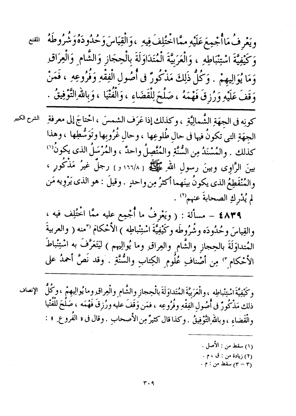 وكَيفِيَّةَ اسْتِنْباطِه، والْعَرَبِيَّةَ المُتَداوَلَةَ بالْحِجازِ والشَامِ والْعِراقِ وما يُوالِيهِمْ، وكُلُّ ذلك مَذْكُورٌ في أُصُولِ الفِقْهِ وفُرُوعِه، فمَن وَقَفَ عليه ورُزِقَ فهْمَه، صَلُحَ للْفُتْيا والْقَضاءِ، وباللهِ التَّوْفِيقُ. وكذا قال كثير مِن الأصحابِ. وقال في «الفُروعِ»: