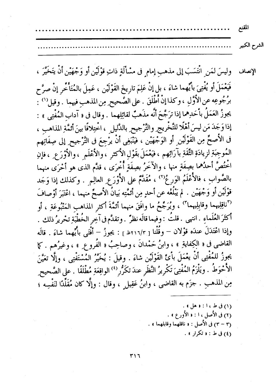 وليسَ لمَنِ انْتَسَبَ إلى مذهبِ إمام في مسْألَةٍ ذاتِ قوْلَين أو وَجْهَين أنْ يتَخَيَّرَ، فَيَعْمَلَ أو يُفتِيَ بأيِّهما شاءَ، بل إنْ عَلِمَ تارِيخَ القَوْلَين، عَمِلَ بالمُتَأَخِّرِ إنْ صرَّح برُجُوعِه عن الأوَّلِ، وكذا إنْ أطْلَقَ. على الصَّحيحِ مِن المذهبِ فيهما. وقيل (¬1): يجوزُ العَمَلُ بأحَدِهما إذا ترَجَّحَ أنَّه مذَهبٌ لقائِلِهما. وقال في «آدابِ المُفْتِي»: إذا وَجَدَ مَن ليسَ أهْلًا للتَّخْريجِ والتَّرْجيحِ بالدَّليلِ، اخْتِلافًا بينَ أئمَّةِ المذاهبِ، في الأصحِّ مِن القَوْلَينِ أو الوَجْهَين، فيَنْبَغِي أنْ يرْجِعَ في التَّرْجيحِ إلى صِفَاتِهم المُوجِبَةِ لزِيادَةِ الثِّقَةِ بآرَائِهم، فيَعْمَلَ بقَوْلِ الأكثرِ، والأعْلَمِ، والأوْرَعِ، فإنِ اخْتُصَّ أحدُهما بصِفَةٍ منها، والآخَرُ بصِفَةٍ أُخْرَى، قدَّم الذي هو أحْرَى منهما بالصَّوابِ، فالأعْلَمُ الوَرِعُ (¬2)، مُقَدَّئم على الأوْرَعِ العالِمِ. وكذلك إذا وَجَد قوْلَين أو وَجْهَين. لم يَبْلُغْه عن أحدٍ مِن أئمَّتِه بَيانُ الأصحِّ منهما، اعْتَبَرَ أوْصافَ [ناقِلِيهما وقابِلِيهما] (¬3)، ويُرَجِّحُ ما وافَقَ منهما أئمَّةَ أكثرِ المذاهبِ المَتْبُوعَةِ، أو أكثر العُلَماءِ. انتهى. قلتُ: وفيما قاله نظر. وتقدَّم في آخِرِ الخُطْبَةِ تحْريرُ ذلك. وإذا اعْتَدَلَ عندَه قوْلان -وقُلْنا: يجوزُ- أفْتَى بأَيِّهما شاءَ. قاله القاضي في «الكِفايةِ»، وابنُ حَمْدانَ، وصاحِبُ «الفُروعِ»، وغيرُهم. كما يجوزُ للمُفْتِي أنْ يعْمَلَ بأيِّ القَوْلَين شاءَ. وقيلَ: يُخَيَّرُ المُسْتَفْتِي، وإلَّا تعَيَّنَ الأحْوَطُ. ويَلْزَمُ المُفْتِيَ تَكْرِيرُ النَّظرَ عندَ تكَرُّرِ (¬4) الواقِعَةِ مُطْلَقًا. على الصَّحيحِ مِن المذهبِ. جزَم به القاضي، وابنُ عَقِيلٍ، وقال: وإلَّا كان مُقَلِّدًا لنَفْسِه؛
