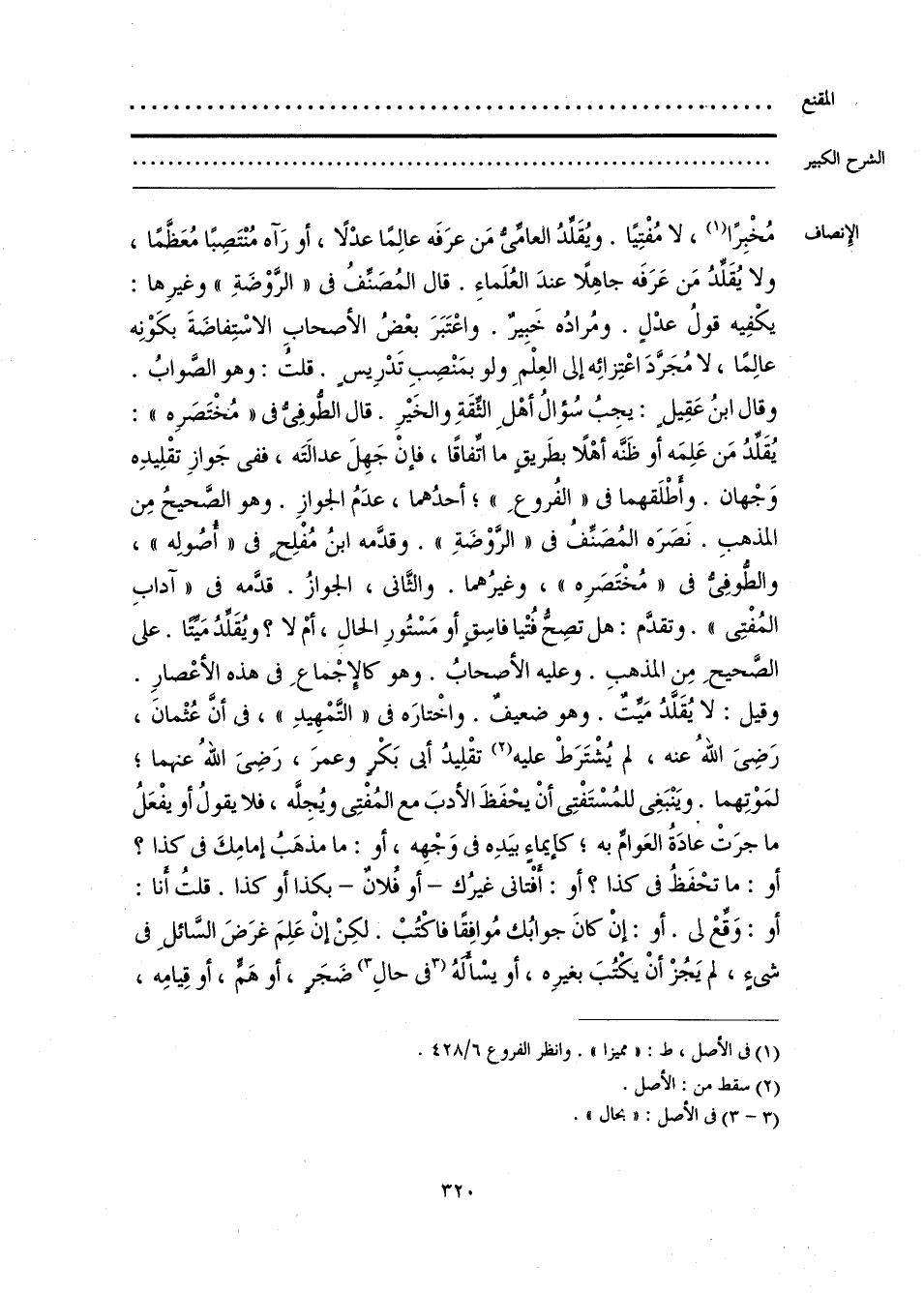 مُخْبِرًا (¬1)، لا مُفْتِيًا. ويُقَلِّدُ العامي مَن عرَفَه عالِمًا عدْلًا، أو رَآه مُنْتَصِبًا مُعَظَّمًا، ولا يُقَلِّدُ مَن عَرَفَه جاهِلًا عندَ العُلَماءِ. قال المُصَنفُ في «الرَّوْضَةِ» وغيرِها: يكْفِيه قولُ عدْلٍ. ومُرادُه خَبِيرٌ. واعْتَبَرَ بعْضُ الأصحابِ الاسْتِفاضَةَ بكَوْنِه عالِمًا، لا مُجَرَّدَ اعْتِزائِه إلى العِلْمِ ولو بمَنْصِبِ تَدْرِيس. قلتُ: وهو الصّوابُ. وقال ابنُ عَقِيل: يجِبُ سُؤالُ أهْلِ الثقَةِ والخَيرِ. قال الطُّوفِيُّ في «مخْتَصَرِه»: يُقَلِّدُ مَن عَلِمَه أو ظَنَّه أهْلًا بطرَيق ما اتِّفاقًا، فإنْ جَهِلَ عدالتَه، ففي جَوازِ تقْلِيدِه وَجْهان. وأطْلَقهما في «الفُروعِ»؛ أحدُهما، عدَمُ الجوازِ. وهو الصَّحيحُ مِن المذهبِ. نَصَرَه المُصَنِّفُ في «الرَّوْضَةِ». وقدَّمه ابنُ مُفْلِح في «أصُولِه»، والطُّوفِيُّ في «مُخْتَصَرِه»، وغيرُهما. والثَّاني، الجوازُ. قدَّمه في «آدابِ المُفْتِي». وتقدَّم: هل تصِحُّ فُتْيا فاسِقٍ أو مَسْتُورِ الحال، أمْ لا؟ ويُقَلِّدُ مَيِّتًا. على الصَّحيحِ مِن المذهبِ. وعليه الأصحابُ. وهو كالإجماعِ في هذه الأعْصارِ. وقيل: لا يُقَلَّدُ مَيِّتٌ. وهو ضعيفٌ. واخْتارَه في «التَّمْهِيدِ»، في أن عُثْمانَ، رَضِيَ اللهُ عنه، لم يُشْتَرَطْ عليه (¬2) تقْلِيدُ أبي بَكْر وعمرَ، رَضِيَ اللهُ عنهما؛ لمَوْتِهما. ويَنْبَغِي للمُسْتَفْتِي أنْ يحْفَظَ الأدبَ مع المُفْتِي ويُجِلَّه، فلا يقولُ أو يفْعَلُ ما جرَتْ عادَةُ العَوام به؛ كإيماء بيَدِه في وَجْهِه، أو: ما مذهَبُ إمامِكَ في كذا؛ أو: ما تحْفَظُ في كذا؛ أو: أفْتاني غيرُك -أو فلانٌ- بكذا أو كذا. قلتُ أنا: أو: وَقِّعْ لي. أو: إنْ كانَ جوابُك مُوافِقًا فاكْتُبْ. لكِنْ إنْ عَلِمَ غرَضَ السَّائلِ في شيء، لم يَجُزْ أنْ يكْتُبَ بغيرِه، أو يسْألهُ [في حالِ] (¬3) ضَجَر، أو هَمٍّ، أو قِيامِه،