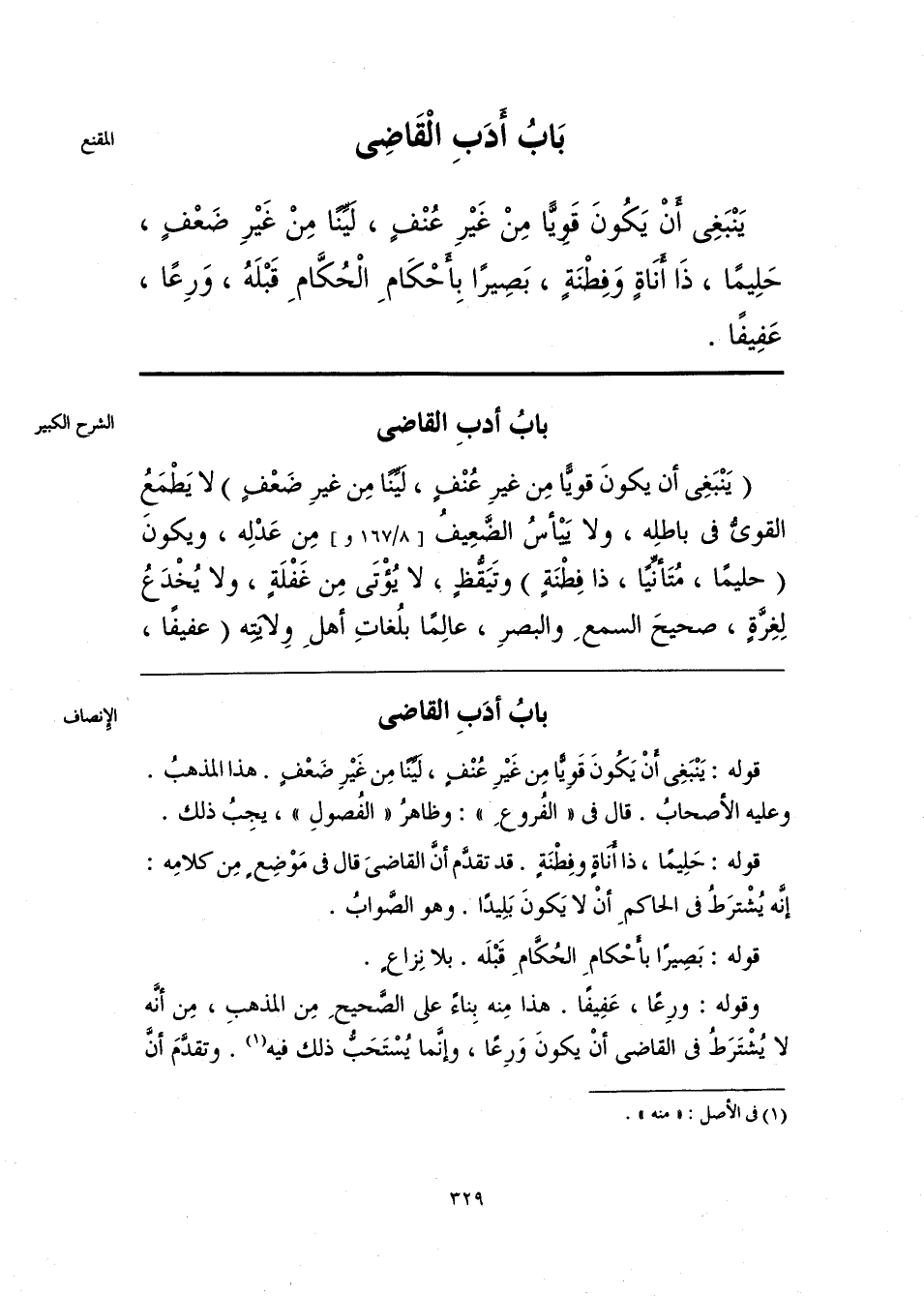 يَنْبَغِي أن يَكُونَ قَويًّا مِنْ غَيرِ عُنْفٍ، صليَنا مِنْ غَيرِ ضَعْفٍ، حَلِيمًا، ذَا أنَاةٍ وَفِطْنَةٍ، بَصِيرًا بِأحْكَامِ الْحُكَّامِ قَبْلَهُ، وَرِعًا، عَفِيفًا.