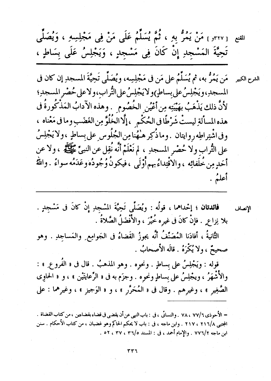 مَنْ يَمُرُّ بِهِ، ثُمَّ يُسَلِّمُ عَلَى مَنْ فِي مَجْلِسِهِ، وَيُصَلِّي تَحِيَّةَ المَسْجِدِ إنْ كَانَ فِي مَسْجِدٍ، وَيَجْلِسُ عَلَى بِسَاطٍ،