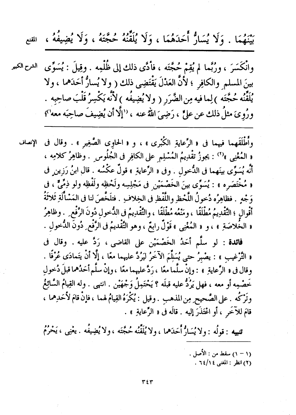 وأطْلَقَهما فيهما في «الرِّعايةِ الكُبْرى»، و «الحاوي الصَّغِيرِ». وقال في «المُغْنِي» (¬1): يجوزُ تقْدِيمُ المُسْلِمِ على الكافِرِ في الجُلُوسِ. وظاهِرُ كلامِه، أنَّه يُسَوِّي بينَهما في الدُّخولِ. وفي «الرِّعايةِ» قولٌ عكْسُه. قالي ابنُ رَزِين في «مُخْتَصَرِه»: يُسَوِّي بينَ الخَصْمَينِ في مَجْلِسِه ولَحْظِه ولَفْظِه ولو ذِمِّي، في وَجْهٍ. فظاهِرُه دُخولُ اللَّحْظِ واللَّفْظِ في الخِلافِ. فتلَخَّصَ لنا في المَسْألةِ ثَلاثة أقْوالٍ؛ التقْدِيمُ مُطْلَقًا، ومَنْعُه مُطْلَقًا، والتَّقْدِيمُ في الدخولِ دُونَ الرَّفْعِ. وظاهِرُ «الخُلاصَةِ»، و «المُغْنِي» قَوْلٌ رابعٌ، وهو التَّقْديمُ في الرَّفْعِ دُونَ الدُّخولِ.