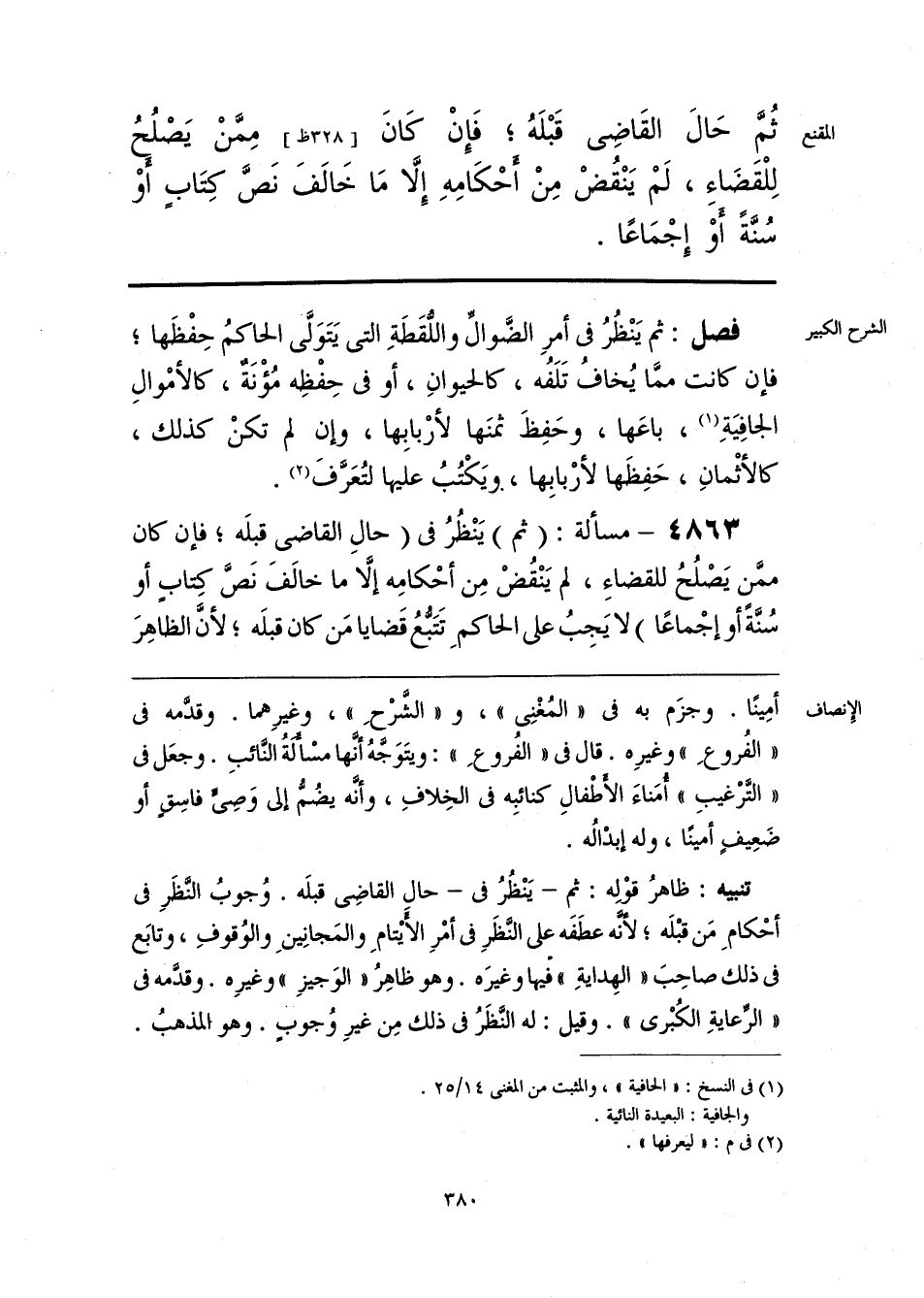 تنبيه: ظاهرُ قوْلِه: ثم -يَنْظُرُ في- حالِ القاضِي قبلَه. وُجوبُ النَّظَرِ في أحْكامِ مَن قبْلَه؛ لأنَّه عطَفَه على النَّظَرِ في أمْرِ الأَيتامِ والمَجانِينِ والوُقوفِ، وتابَع في ذلك صاحِبَ «الهِدايةِ» فيها وغيرَه. وهو ظاهِرُ «الوَجيزِ» وغيرِه. وقدَّمه في «الرِّعايةِ الكُبْرى». وقيل: له النَّظَرُ في ذلك مِن غيرِ وُجوبٍ. وهو المذهبُ.