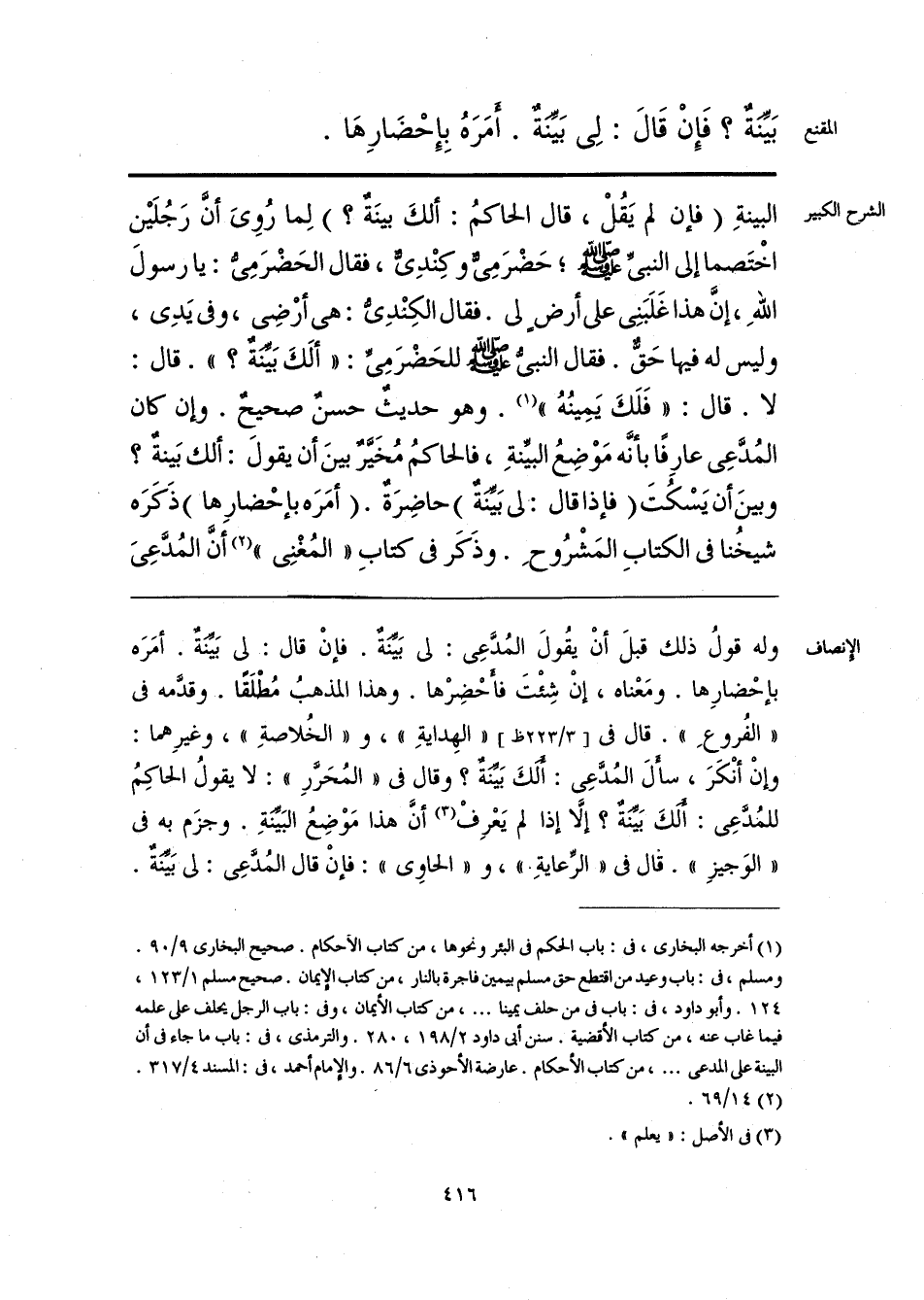 وله قولُ ذلك قبلَ أنْ يقُولَ المُدَّعِي: لي بَيِّنَةٌ. فإنْ قال: لي بَيِّنَةٌ. أمَرَه بإحْضارِها. ومَعْناه، إنْ شِئْتَ فأَحْضِرْها. وهذا المذهبُ مُطْلَقًا. وقدَّمه في «الفُروعِ». قال في «الهِدايةِ»، و «الخُلاصةِ»، وغيرِهما: وإنْ أنْكَرَ، سأَلَ المُدَّعِي: أَلَكَ بَيِّنَةٌ؟ وقال في «المُحَرَّرِ»: لا يقولُ الحاكِمُ للمُدَّعِي: أَلَكَ بَيِّنَةٌ؟ إلَّا إذا لم يَعْرِفْ (¬1) أنَّ هذا مَوْضِعُ البَيِّنَةِ. وجزَم به في «الوَجيزِ». قال في «الرِّعايةِ»، و «الحاوي»: فإنْ قال المُدَّعِي: لي بَيِّنَةٌ.