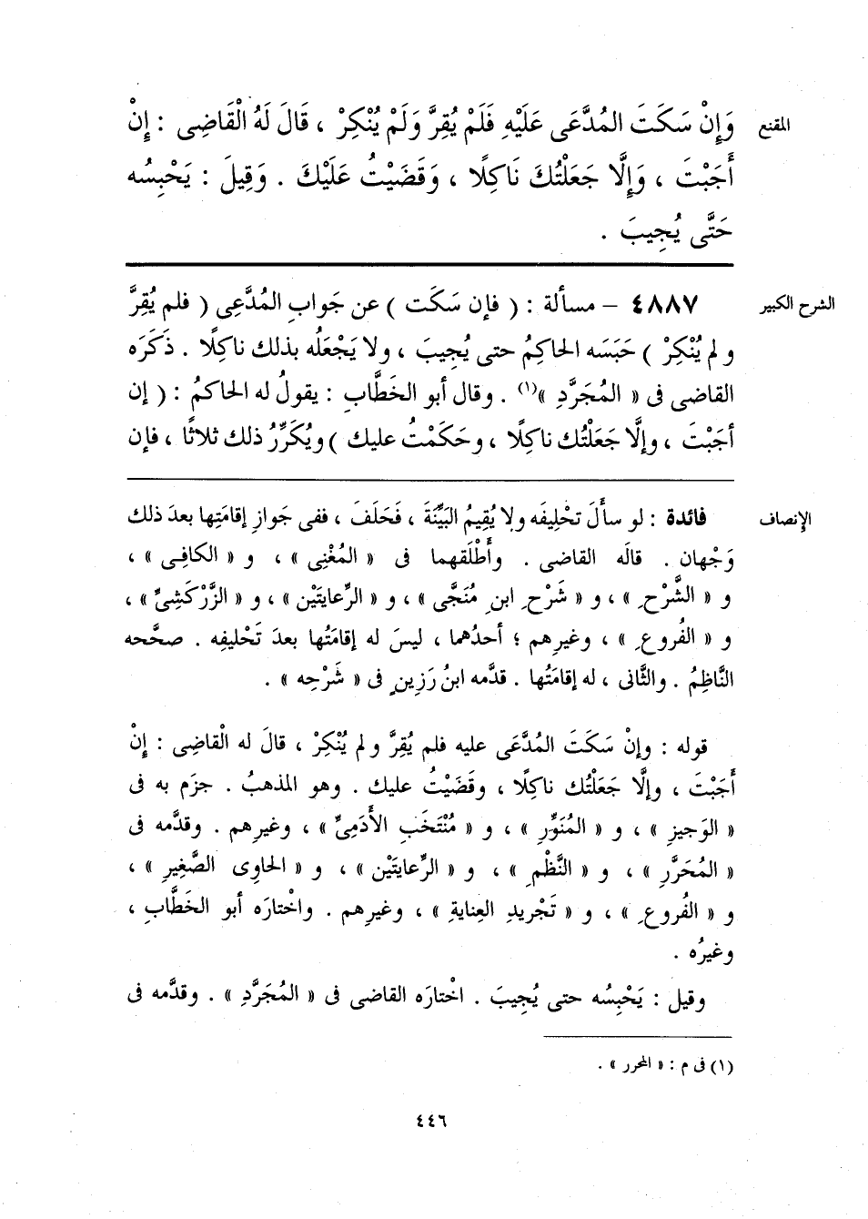 قوله: وإنْ سَكَتَ المُدَّعَى عليه فلم يُقِرَّ ولم يُنْكِرْ، قال له الْقاضِي: إنْ أجَبْتَ، وإلَّا جَعَلْتُك ناكِلًا، وقَضَيتُ عليك. وهو المذهبُ. جزَم به في «الوَجيزِ»، و «المُنَوِّرِ»، و «مُنْتَخَبِ الأدَمِيِّ»، وغيرِهم. وقدَّمه في «المُحَرَّرِ»، و «النَّظْمِ»، و «الرِّعايتَين»، و «الحاوي الصَّغِيرِ»، و «الفُروعِ»، و «تَجْريدِ العِنايةِ»، وغيرِهم. واخْتارَه أبو الخَطَّابِ، وغيرُه.