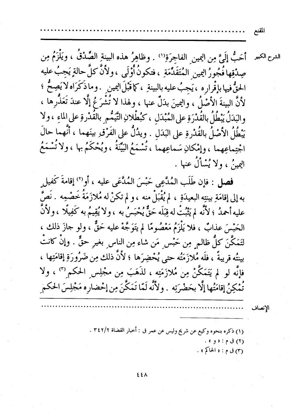 فصل: فإن طَلَب المُدَّعِي حَبْسَ المُدَّعَى عليه، أو (¬2) إقامةَ كَفيلٍ به إلى إقامَةِ بينتِه البعيدَةِ، لم يُقْبَلْ منه، ولم تكنْ له ملازَمَة خَصمِه. نَصَّ عليه أحمدُ؛ لأنَّه لم يَثْبُتْ له قِبَلَه حَق يُحْبَسُ به، ولا يُقِيمُ به كَفِيلًا، ولأن الحَبْس عذاب، فلا يَلْزَمُ مَعْصُومًا لم يتَوَجَّهْ عليه حَق، ولو جازَ ذلك، لتَمَكَّنَ كلُّ ظالم مِن حَبْسِ مَن شاء مِن الناسِ بغيرِ حق. وإنْ كانت بينتُه قريبةً، فلَه مُلازَمَتُه حتى يُحْضِرَها؛ لأنَّ ذلك مِن ضَرُورَةِ إقامَتِها، فإنَّه لو لم يَتَمَكَّنْ مِن مُلازَمَتِه، لذَهَبَ مِن مجْلِسِ الحكمِ (¬3)، ولا تُمْكِنُ إقامَتُها إلَّا بحَضْرَتِه. ولأنَّه لَمّا تَمَكَّنَ مِن إحْضارِه مَجْلِسَ الحكمِ