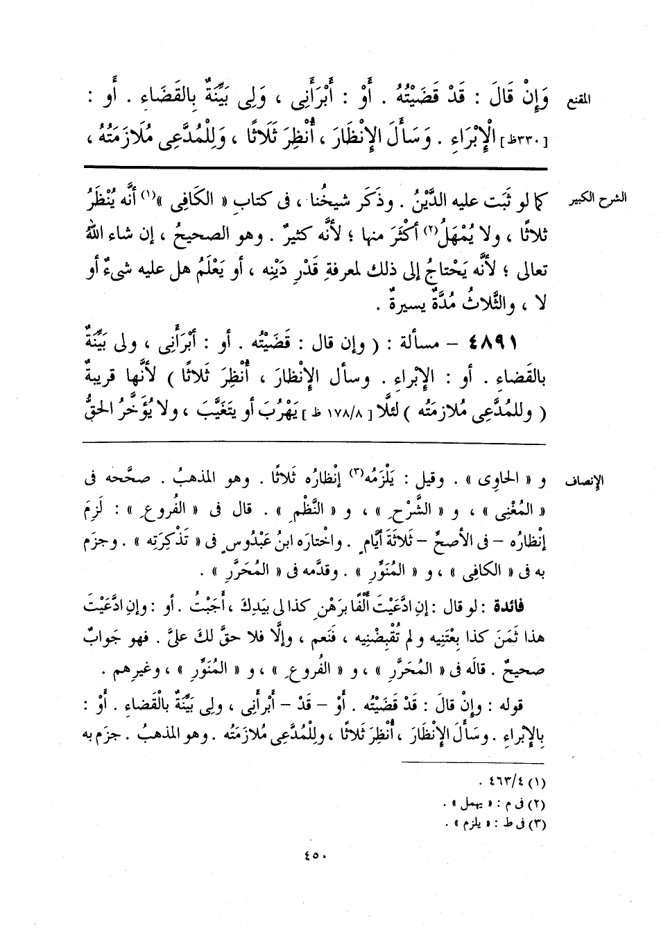 و «الحاوي». وقيل: يَلْزَمُه (¬1) إنْظارُه ثَلاثًا. وهو المذهبُ. صحَّحه في «المُغْنِي»، و «الشَّرْحِ»، و «النَّظْمِ». قال في «الفُروعِ»: لَزِمَ إنْظارُه -في الأصحِّ- ثَلاثَةَ أيام. واخْتارَه ابنُ عَبْدُوس في «تَذْكِرَتِه». وجزَم به في «الكافِي»، و «المُنَوِّرِ». وقدَّمه في «المُحَرَّرِ».