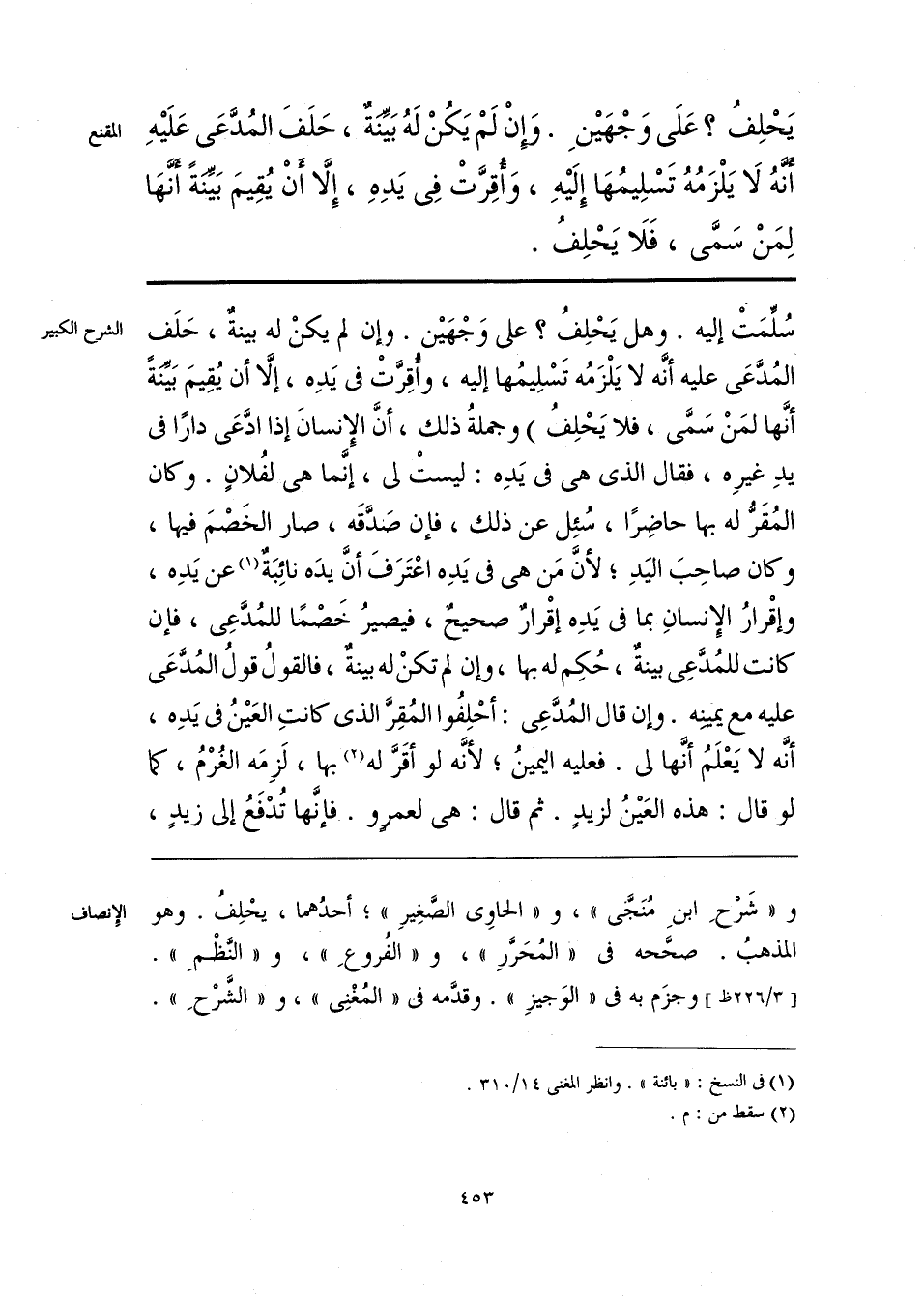 و «شَرْحِ ابنِ مُنَجى»، و «الحاوي الصَّغِيرِ»؛ أحدُهما، يحْلِف. وهو المذهبُ. صحَّحه في «المُحَرَّرِ»، و «الفُروعِ»، و «النَّظْمِ». وجزَم به في «الوَجيزِ». وقدَّمه في «المُغْنِي»، و «الشَّرْحِ».