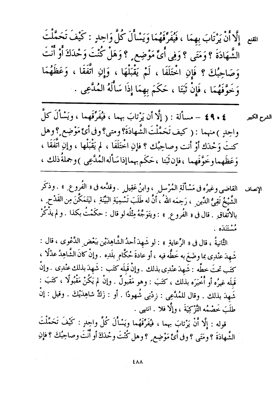 قوله: إلَّا أنْ يَرْتابَ بهما، فيُفَرِّقَهُما ويَسْأَلَ كُلَّ واحِدٍ: كَيْفَ تَحَمَّلْتَ الشَّهادَةَ؟ ومَتَى؟ وفى أىِّ مَوْضِعٍ؟ وهل كُنْتَ وحْدَكَ أو أنْتَ وصاحِبُكَ؟ فإنِ