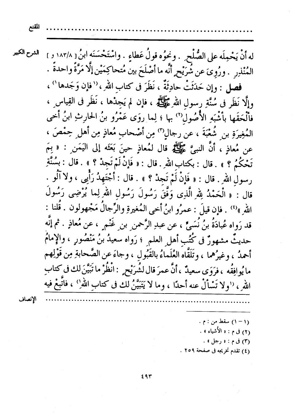 قال: «الْحَمْدُ لِلّهِ الَّذِى وَفَّقَ رَسُولَ رَسُولِ اللهِ لِما يُرْضِى رَسُولَ اللهِ» (¬4). فإن قيلَ: عمرُو ابنُ أخى المُغيرةِ والرِّجالُ مَجْهولون. قُلنا: قد رَواه عُبادَةُ بنُ نُسَىٍّ، عن عبدِ الرَّحمنِ بنِ غَنْمٍ، عن مُعاذٍ. ثم إنَّه حديثٌ مشهورٌ في كُتُبِ أهلِ العلمِ؛ رَواه سعيدُ بنُ مَنْصورٍ، والِإمامُ أحمدُ، وغيرُهما، وتَلَقَّاه العُلَماءُ بالقَبُولِ، وجاءَ عن الصَّحابةِ مِن قَوْلِهم ما يُوافِقُه، فرَوَى سعيدٌ، أنَّ عمرَ قال لشُرَيْحٍ: انْظُرْ ما تَبَيَّنَ لك في كتابِ اللهِ، [ولا تَسْألْ عنه أحدًا، وما لا يَتَبَيَّنُ لك في كتابِ الله] (1)، فاتَّبعْ فيه