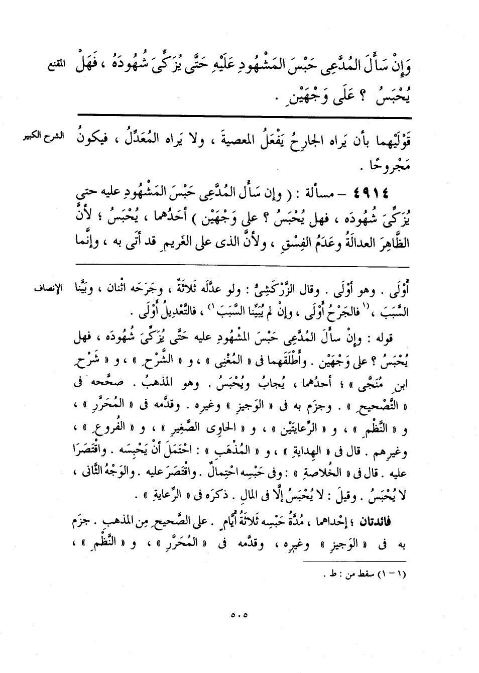 قوله: وإنْ سأَلَ المُدَّعِى حَبْسَ المشْهُودِ عليه حَتَّى يُزَكِّىَ شُهُودَه، فهل يُحْبَسُ؟ على وَجْهَيْن. وأَطْلَقَهما فى «المُغْنِى»، و «الشَّرْحِ»، و «شَرْحِ ابنِ مُنَجَّى»؛ أحدُهما، يُجابُ ويُحْبَسُ. وهو المذهبُ. صحَّحه. فى «التَّصْحيحِ». وجزَم به فى «الوَجيزِ» وغيرِه. وقدَّمه فى «المُحَرَّرِ»، و «النَّظْمِ»، و «الرِّعايتَيْن»، و «الحاوِى الصَّغِير»، و «الفُروعِ»، وغيرِهم. قال فى «الهِدايةِ»، و «المُذْهَبِ»: احْتَمَلَ أنْ يَحْبِسَه. واقْتَصَرَا عليه. قال فى «الخُلاصةِ»: وفى حَبْسِه احْتِمالٌ. واقْتَصَرَ عليه. والوَجْهُ الثَّانى، لا يُحْبَسُ. وقيلَ: لا يُحْبَسُ إلَّا فى المالِ. ذكرَه فى «الرِّعايةِ».