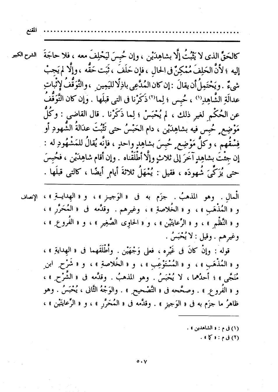 مُنَجَّي»؛ أحدُهما، لا يُحْبَسُ. وهو المذهبُ. وقدَّمه فى «الشَّرْحِ»، و «الفُروعِ». وصحَّحه فى «التَّصْحيحِ». والوَجْهُ الثَّاني، يُحْبَسُ. وهو ظاهرُ ما جزَم به فى «الوَجيزِ». وقدَّمه فى «المُحَرَّرِ»، و «الرِّعايتَيْن»،