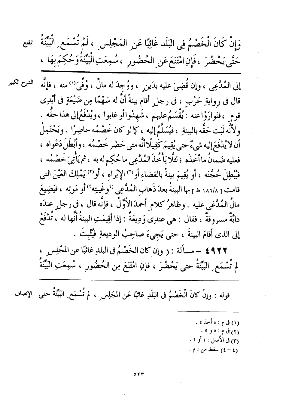 وَإِنْ كَانَ الْخَصْمُ فِى البَلَد غَائِبًا عَنِ المَجْلِسِ، لَمْ تُسْمَعِ الْبَيِّنَةُ حَتَّى يَحْضُرَ، فَإنِ امْتَنَعَ عَنِ الحُضُورِ، سُمِعَتِ الْبَيِّنَةُ وَحُكِمَ بِهَا،