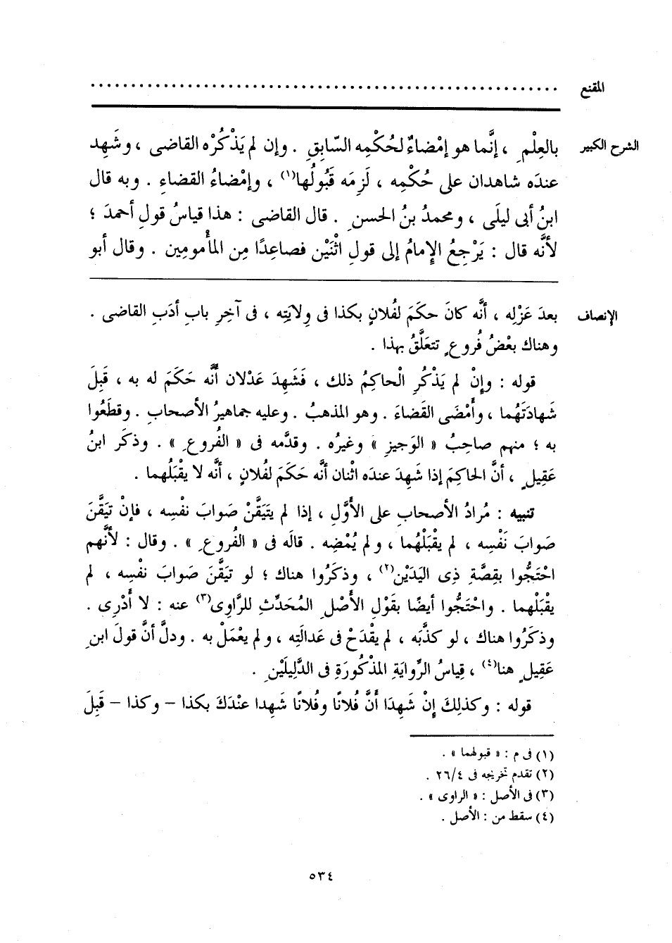 تنبيه: مُرادُ الأصحابِ على الأوَّلِ، إذا لم يتَيَقَّنْ صَوابَ نفْسِه، فإنْ تيَقَّنَ صَوابَ نَفْسِه، لم يقْبَلْهُما، ولم يُمْضِه. قالَه فى «الفُروعِ». وقال: لأنَّهم احْتَجُّوا بقِصَّةِ ذِى اليَدَيْن (¬1)، وذكَرُوا هناك؛ لو تيَقَّنَ صَوابَ نفْسِه، لم يقْبَلْهما. واحْتَجُّوا أيضًا بقَوْلِ الأصْلِ المُحَدِّثِ للرَّاوِى (¬2) عنه: لا أدْرِى.