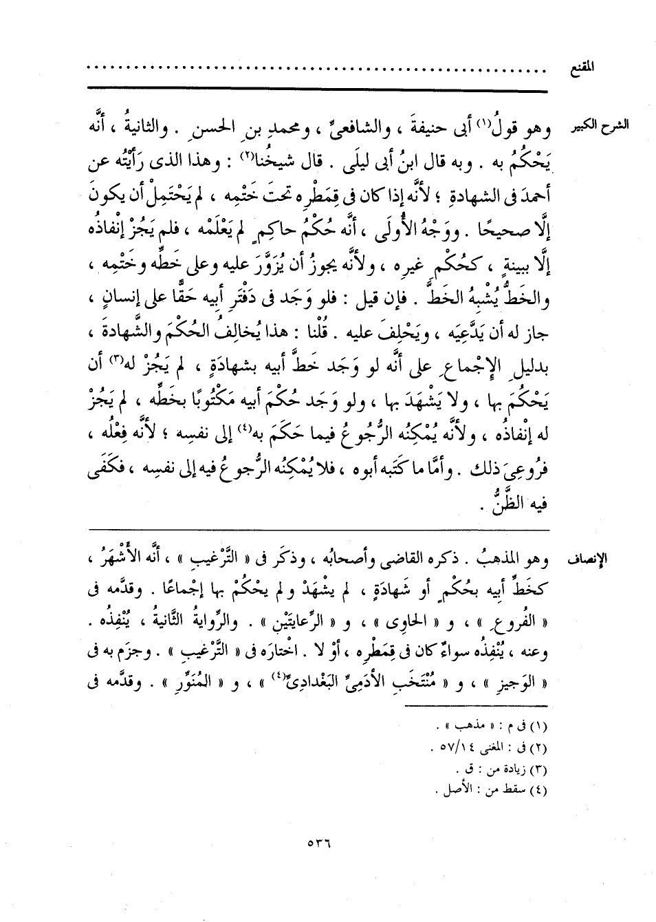وهو المذهبُ. ذكره القاضى وأصحابُه، وذكَر فى «التَّرْغيبِ»، أنَّه الأَشْهَرُ، كخَطِّ أبِيه بحُكْمٍ أو شَهادَةٍ، لم يشْهَدْ ولم يحْكُمْ بها إجْماعًا. وقدَّمه فى «الفُروعِ»، و «الحاوِى»، و «الرِّعايتَيْن». والرِّوايةُ الثَّانيةُ، يُنْفِذُه.
