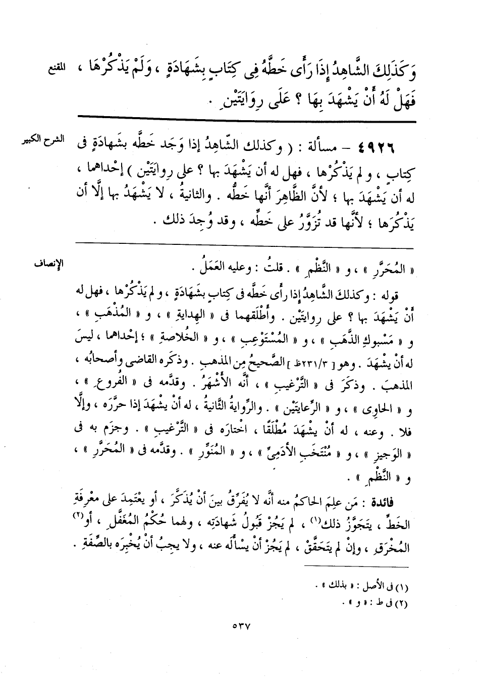 قوله؛ وكذلكَ الشَّاهِدُ إذا رأى خَطَّه فى كِتابٍ بشَهَادَةٍ، ولم يَذْكُرْها، فهل له أنْ يَشْهَدَ بها؟ على رِوايتَيْن. وأطْلَقهما فى «الهِدايةِ»، و «المُذْهَبِ»، و «مَسْبوكِ الذَّهَبِ»، و «المُسْتَوْعِبِ»، و «الخُلاصةِ»؛ إحْداهما، ليسَ له أنْ يشْهَدَ. وهو الصَّحيح مِن المذهبِ. وذكَره القاضى وأصحابُه، المذهبَ. وذكَرَ فى «التَّرْغيبِ»، أنَّه الأَشْهَرُ. وقدَّمه فى «الفُروعِ»، و «الحاوِى»، و «الرِّعايتَيْن». والرِّوايةُ الثَّانيةُ، له أنْ يشْهَدَ إذا حرَّرَه، وإلَّا فلا. وعنه، له أنْ يشْهَدَ مُطْلَقًا، اخْتارَه فى «التَّرْغيبِ». وجزَم به فى