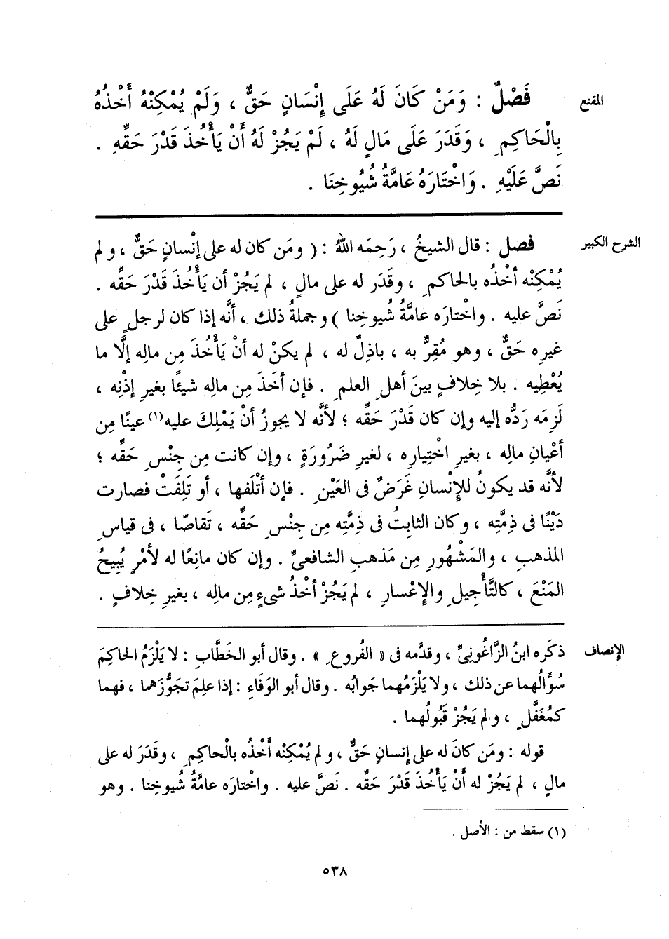 قوله: ومَن كانَ له على إنسانٍ حَقٌّ، ولم يُمْكِنْه أخْذُه بالْحاكمِ، وقَدَرَ له على مالٍ، لم يَجُزْ له أنْ يَأْخُذَ قَدْرَ حَقِّه. نَصَّ عليه. واخْتارَه عامَّةُ شُيوخِنا. وهو