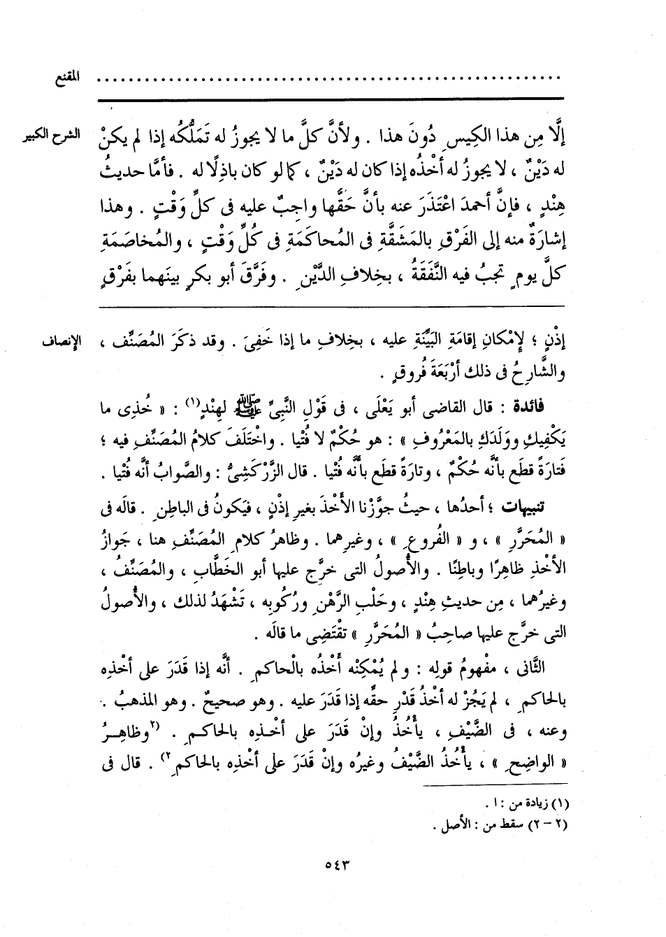 تنبيهات؛ أحدُها، حيثُ جوَّزْنا الأخْذَ بغيرِ إذْنٍ، فيَكونُ فى الباطِنِ. قالَه فى «المُحَرَّرِ»، و «الفُروعِ»، وغيرِهما. وظاهرُ كلامِ المُصَنِّفِ هنا، جَوازُ الأخْذِ ظاهِرًا وباطِنًا. والأصولُ التى خرَّج عليها أبو الخَطَّابِ، والمُصَنِّفُ، وغيرُهما، مِن حديثِ هِنْدٍ، وحَلْبِ الرَّهْنِ ورُكُوبِه، تَشْهَدُ لذلك، والأُصولُ التى خرَّج عليها صاحِبُ «المُحَرَّرِ» تقتَضِى ما قالَه.