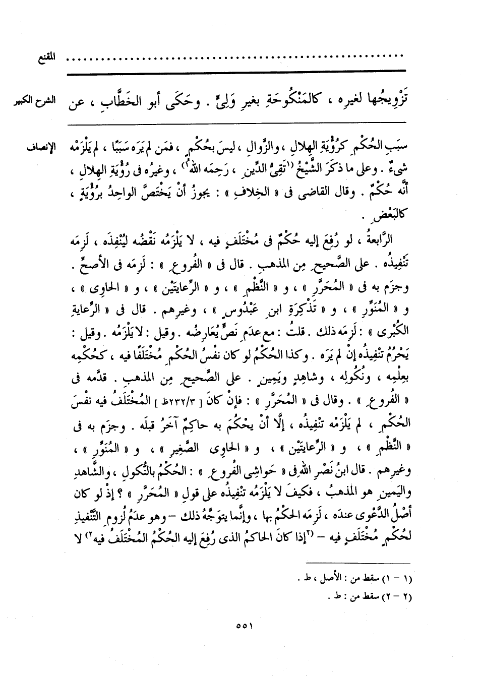 «النَّظْمِ»، و «الرِّعايتَيْن»، و «الحاوِى الصَّغِيرِ»، و «المُنَوِّرِ»، وغيرِهم. قال ابنُ نَصْرِ اللهِ فى «حَواشِى الفُروعِ»: الحُكْمُ بالنُّكولِ، والشَّاهدِ واليَمينِ هو المذهبُ، فكيفَ لا يَلْزَمُه تنْفِيذُه على قولِ «المُحَرَّرِ»؟ إذْ لو كان أصْلُ الدَّعْوى عندَه، لَزِمَه الحكْمُ بها، وإنَّما يتوَجَّهُ ذلك- وهو عدَمُ لُزومِ التَّنْفيذِ لحُكْم مُخْتَلَفٍ فيه-[إذا كانَ الحاكمُ الذى رُفِعَ إليه الحُكْمُ المُخْتَلَفُ فيه] (¬2) لا