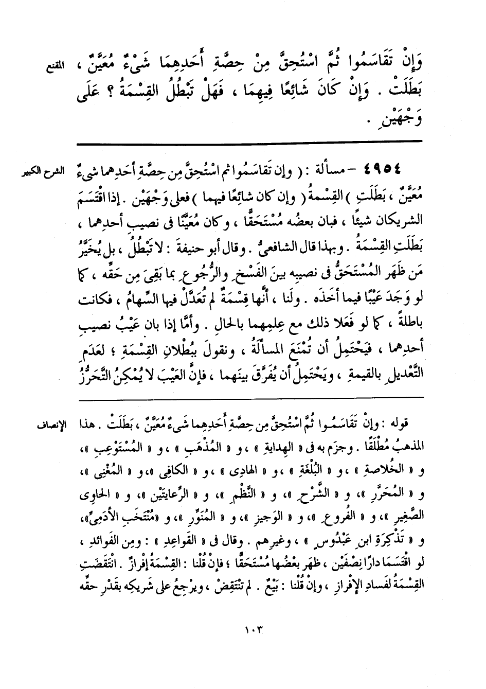 قوله: وإنْ تَقَاسَمُوا ثُم اسْتُحِقَّ مِن حِصَّةِ أحَدِهِما شَئٌ مُعَيَّنٌ، بَطَلَتْ. هذا المذهبُ مُطْلَقًا. وجزَم به فى «الهِدايةِ»، و «المُذْهَبِ»، و «المُسْتَوْعِبِ»، و «الخُلاصةِ»، و «البُلْغَةِ»، و «الهادِى»، و «الكافِى»، و «المُغْنِى»، و «المُحَرَّرِ»، و «الشَّرْحِ»، و «النَّظْمِ»، و «الرِّعايتَيْن»، و «الحاوِى الصَّغِيرِ»، و «الفُروعِ»، و «الوَجيزِ»، و «المُنَوِّرِ»، و «مُنْتَخَبِ الأدَمِىِّ»، و «تَذْكِرَةِ ابنِ عَبْدُوسٍ»، وغيرِهم. وقال فى «القَواعِدِ»: ومِن الفَوائدِ، لو اقْتَسَمَا دارًا نِصْفَيْن، ظهَر بعْضُها مُسْتَحَقًّا؛ فإنْ قُلْنا: القِسْمَةُ إفْرازٌ. انْتَقَضَتِ القِسْمَةُ لفَسادِ الإفْرازِ، وإنْ قُلْنا: بَيْعٌ. لم تنْتَقِضْ، ويرْجِعُ على شَريكِه بقَدْرِ حقِّه