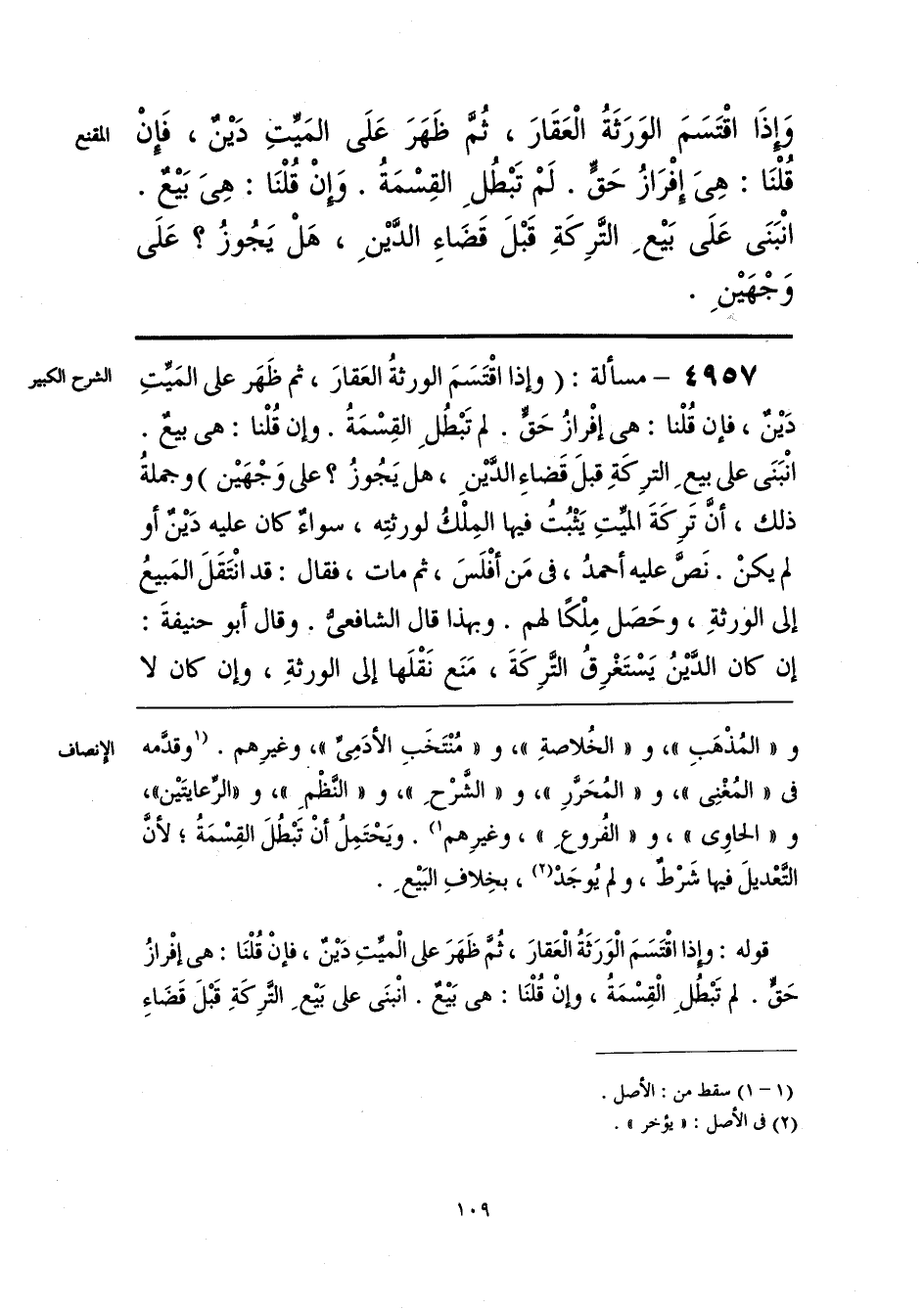 قوله: وإِذا اقْتَسَمَ الْوَرَثَةُ الْعَقارَ، ثُمَّ ظَهَرَ على الْميِّتِ دَيْنٌ، فإنْ قُلْنَا: هى إفْرازُ حَقٍّ. لم تَبْطُلِ الْقِسْمَةُ، وإنْ قُلْنَا: هى بَيْعٌ. انْبنَى على بَيْعِ التَّرِكَةِ قَبْلَ قَضَاءِ