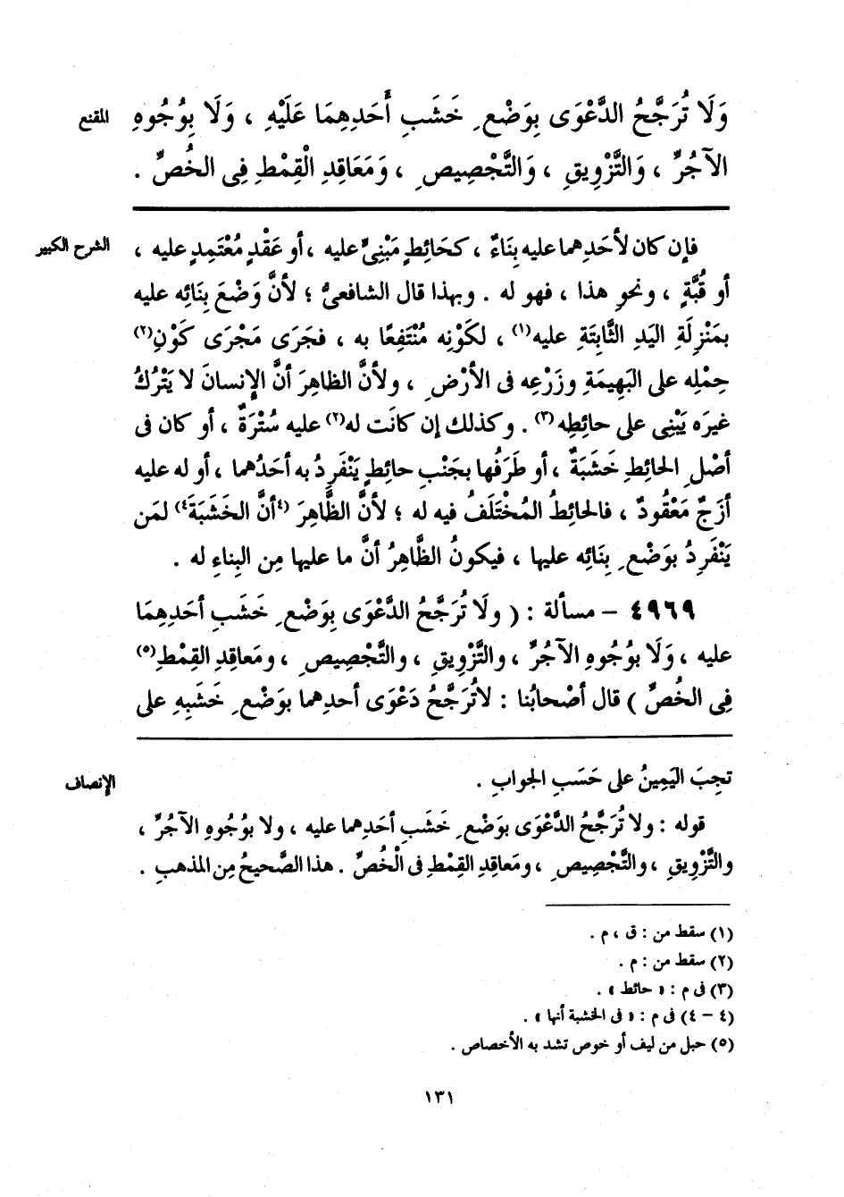 قوله: ولا تُرَجَّحُ الدَّعْوَى بوَضْعِ خَشَبِ أحَدِهما عليه، ولا بوُجُوهِ الآجُرِّ، والتَّزْوِيقِ، والتَّجْصِيصِ، ومَعاقِدِ القِمْطِ في الْخُصِّ. هذا الصَّحيحُ مِن المذهبِ.