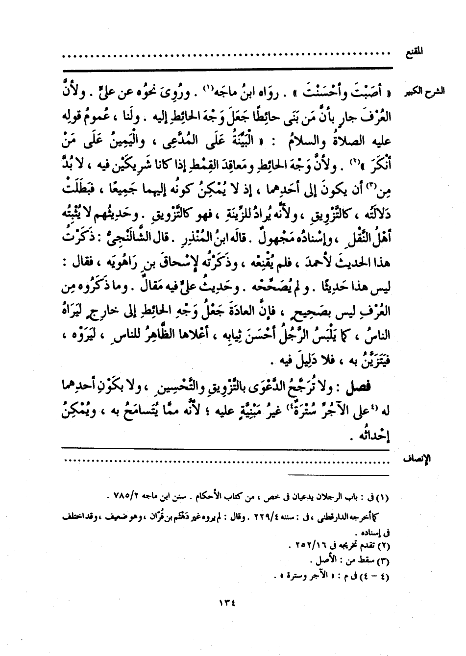 «أصَبْتَ وأحْسَنْتَ». روَاه ابنُ ماجَه (¬1). ورُوِىَ نحوُه عن عليٍّ. ولأنَّ العُرْفَ جارٍ بأنَّ مَن بَنَى حائِطًا جَعَلَ وَجْهَ الحائِطِ إليه. ولَنا، عُمومُ قولِه عليه الصلاةُ والسلامُ: «الْبَيِّنَةُ عَلَى المُدَّعِى، واليَمِينُ عَلَى مَنْ أنْكَرَ» (¬2). ولأنَّ وَجْهَ الحائِطِ ومَعاقِدَ القِمْطِ إذا كانا شَرِيكَيْن فيه، لا بُدَّ مِن (¬3) أن يكونَ إلى أحَدِهما، إذ لا يُمْكِنُ كونُه إليهما جَمِيعًا، فبَطَلَتْ دَلالتُه، كالتَّزْوِيقِ، ولأنَّه يُرادُ للزِّينَةِ، فهو كالتَّزْويقِ. وحَدِيثُهم لا يُثْبِتُه أهْلُ النَّقْلِ، وإسْنادُه مَجْهولٌ. قالَه ابنُ المُنْذِرِ. قال الشَّالَنْجِيُّ: ذَكَرْتُ هذا الحديثَ لأحمدَ، فلم يُقنِعْه، وذَكَرْتُه لإسْحاقَ بنِ رَاهُويَه، فقال: ليس هذا حَدِيثًا. ولم يُصَحِّحْه. وحَدِيثُ علىٍّ فيه مَقالٌ. وما ذَكَرُوه مِن