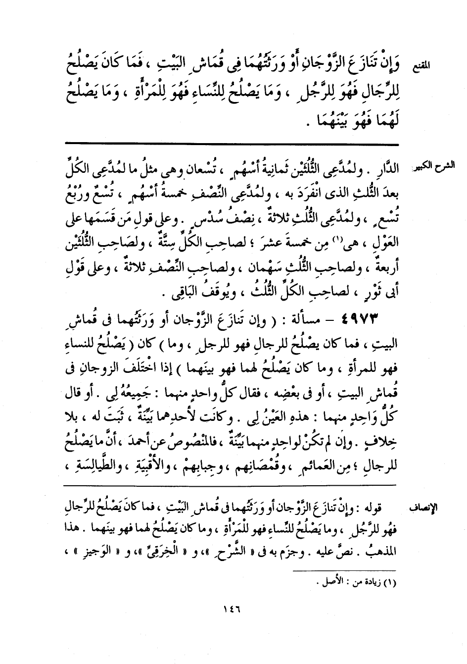 وَإِنْ تَنَازَعِ الزَّوْجَانِ أَوْ وَرَثتهُمَا في قُمَاشِ البَيْتِ، فَمَا كَانَ يَصْلُحُ لِلرِّجَالِ فهُوَ لِلرَّجُلِ، وَمَا يَصْلُحُ لِلنِّسَاءِ فَهُوَ لِلْمَراةِ، وَمَا يَصْلُحُ