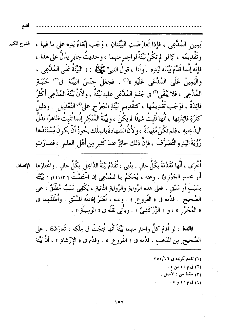 أخرَى، أنَّها مُقَدَّمَة بكُلِّ حالٍ. يعْنِي، تُقَدَّمُ بَيِّنةُ الدَّاخِلِ بكُل حالٍ. واخْتارَها أبو محمدٍ الجَوْزِىُّ. وعنه، يُحْكَمُ بها للمُدَّعِى إنِ اخْتَصَّتْ بَيِّنتُه بسَبَبٍ أو سَبْقٍ. فعلى هذه الرِّوايةِ والرِّوايةِ الثَّانيةِ، يَكفِى سَبَبٌ مُطْلَقٌ، على الصَّحيحِ. قدَّمه في «الفُروعِ». وعنه، تُعْتَبَرُ إفادَتُه للسَّبْقِ. وأطلَقَهما في «المُحَرَّرِ»، و «الزَّرْكَشِىِّ». ويأْتِى نقْلُه في «الوَسِيلَةِ».