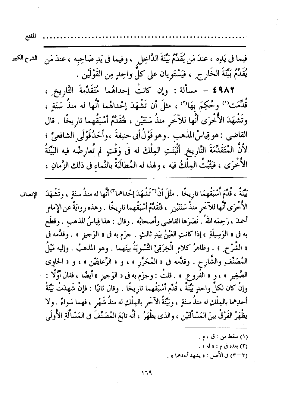 بَيِّنَة، قُدِّمَ أسْبَقُهمَا تارِيخًا. مثْلَ أنْ [تَشْهَدَ إحْداهما] (¬1) أنَّها له منذُ سنَةٍ، وتَشْهَدَ الأخْرَى أنَّها للآخَرِ منذُ سَنَتَيْنِ، فتُقَدم أسْبَقُهما تارِيخًا. وهذه رِوايَة عن الإمامِ أحمدَ، رَحِمَه اللهُ. نَصَرَها القاضى وأصحابُه. وقال: هذا قِياسُ المذهبِ. وقطَع به في «الوَسِيلَةِ» وإذا كانتِ العَيْنُ بيَدِ ثالثٍ. جزَم به في «الوَجيزِ». وقدَّمه في «الشرْحِ». وظاهرُ كلامِ الْخِرَقِى التَسْوِيَةُ بينَهما. وهو المذهبُ. وإليه مَيْلُ المُصَنفِ والشَّارِح. وقدَّمه في «المُحَرَّرِ»، و «الرِّعَايتَيْن»، و «الحاوِى الصَّغِيرِ»، و «الفُروع». قلتُ: وجزَم به في «الوَجيزِ» أيضًا، فقال أولًا: وإنْ كان لكِّل واحدٍ بَيِّنَةٌ، قُدِّم أسْبَقُهما تارِيخًا. وقال ثانيًا: فإنْ شَهِدَتْ بَيِّنَةَ أحدِهما بالمِلْكِ له منذُ سنَةٍ، وبَينةُ الآخَرِ بالمِلْكِ له منذُ شَهْر، فهما سَواءٌ. ولا يظْهَرُ الفَرْقُ بينَ المَسْألتَيْن، والذي يظْهَرُ، أنَه تابَعَ المُصَنَّفَ في المَسْأَلَةِ الأولَى