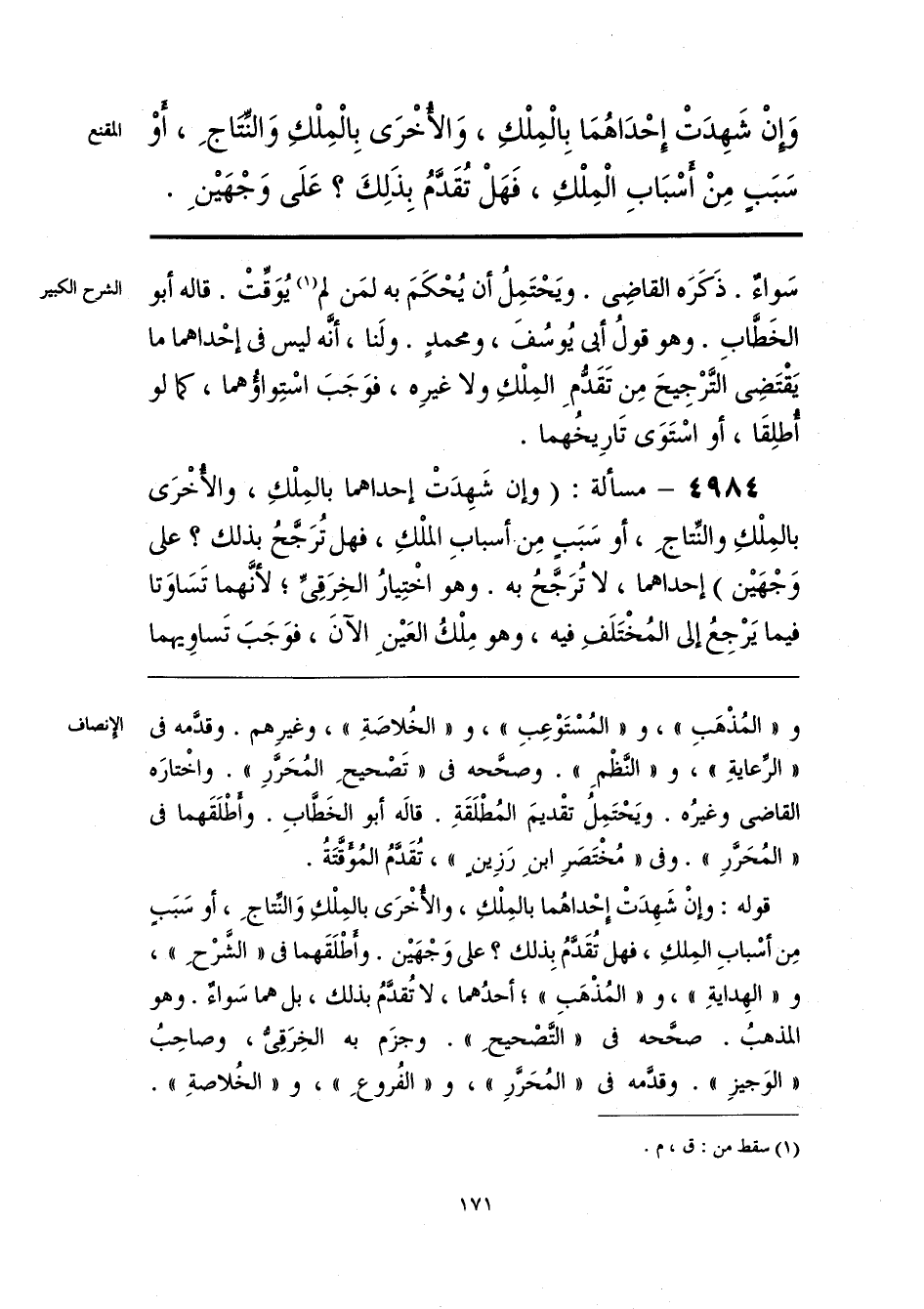 قوله: وإنْ شَهِدَتْ إحْداهُما بالمِلْكِ، والأخْرَى بالمِلْك وَالنِّتاجِ، أو سَبَبٍ مِن أسْبابِ المِلكِ، فهل تُقَدَّمُ بِذلك؟ على وَجْهَيْن. وأطْلَقَهما في «الشَّرْحِ»، و «الهِدايةِ»، و «المُذْهَبِ»؛ أحدُهما، لا تُقدَّمُ بذلك، بل هما سَواءٌ. وهو المذهبُ. صحَّحه في «التَّصْحيحِ». وجزَم به الخِرَقِى، وصاحِبُ «الوَجيزِ». وقامه فى «المُحَرَّرِ»، و «الفُروعِ»، و «الخُلاصةِ».