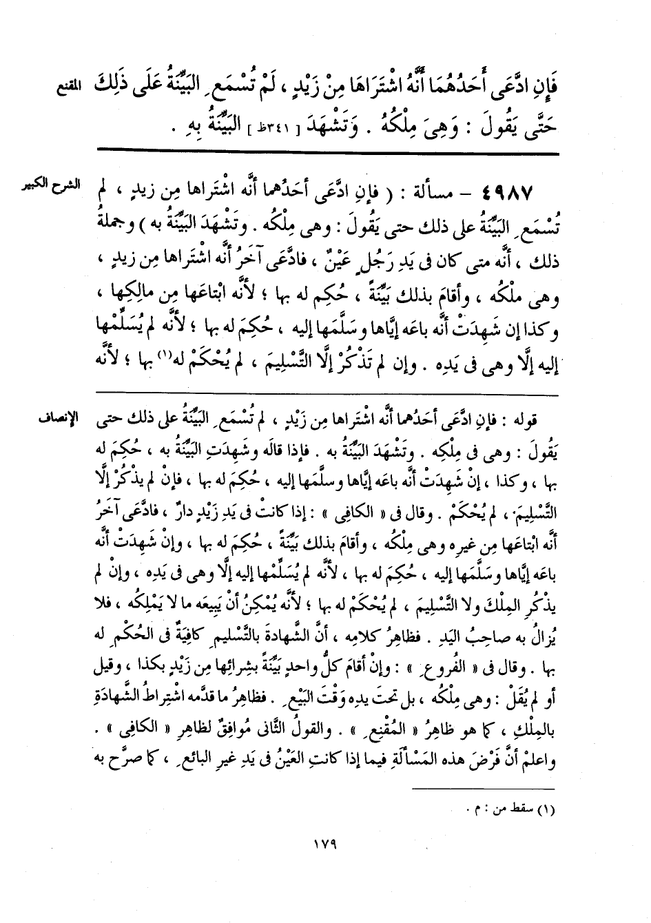 قوله: فإنِ ادَّعَى أحَدُهما أنَّه اشْتَراها مِن زَيْدٍ، لم تُسْمَعِ البَيِّنَةُ على ذلك حتى يَقُولَ: وهي في مِلْكِه. وتَشْهَدَ البَيِّنَةُ به. فإذا قالَه وشَهِدَتِ البَيِّنَةُ به، حُكِمَ له بها، وكذا، إنْ شَهِدَتْ أنَّه باعَه إيَّاها وسلَّمَها إليه، حُكِمَ له بها، فإنْ لم يذْكُرْ إلاَّ التَّسْلِيمَ، لم يُحْكَمْ. وقال في «الكافِى»: إذا كانتْ في يَدِ زَيْدٍ دارٌ، فادَّعَى آخَرُ أنَّه ابْتاعَها مِن غيرِه وهي مِلْكُه، وأقامَ بذلك بَيِّنةً، حُكِمَ له بها، وإنْ شَهِدَتْ أنَّه باعَه إيَّاها وسَلَّمَها إليه، حُكِمَ له بها, لأنَّه لم يُسَلِّمْها إليه إلَّا وهي في يَدِه، وإنْ لم يذْكُرِ المِلْكَ ولا التَّسْلِيمَ، لم يُحْكَمْ له بها؛ لأنَّه يُمْكِنُ أنْ يَبِيعَه ما لا يَمْلِكُه، فلا يُزالُ به صاحِبُ اليَدِ. فظاهِرُ كلامِه، أنَّ الشهادةَ بالتَّسْليمِ كافِيَة في الحُكْمِ له بها. وقال في «الفُروعِ»: وإنْ أقامَ كلُّ واحدٍ بَيِّنةً بشِرائِها مِن زَيْدٍ بكذا، وقيل أو لم يُقَلْ: وهي مِلْكُه، بل تحتَ يدِه وَقْتَ البَيْعِ. فظاهِرُ ما قدَّمه اشْتِراطُ الشَّهادَةِ بالمِلْكِ، كما هو ظاهِرُ «المُقْنِعِ». والقولُ الثَّانى مُوافِق لظاهِرِ «الكافِى».