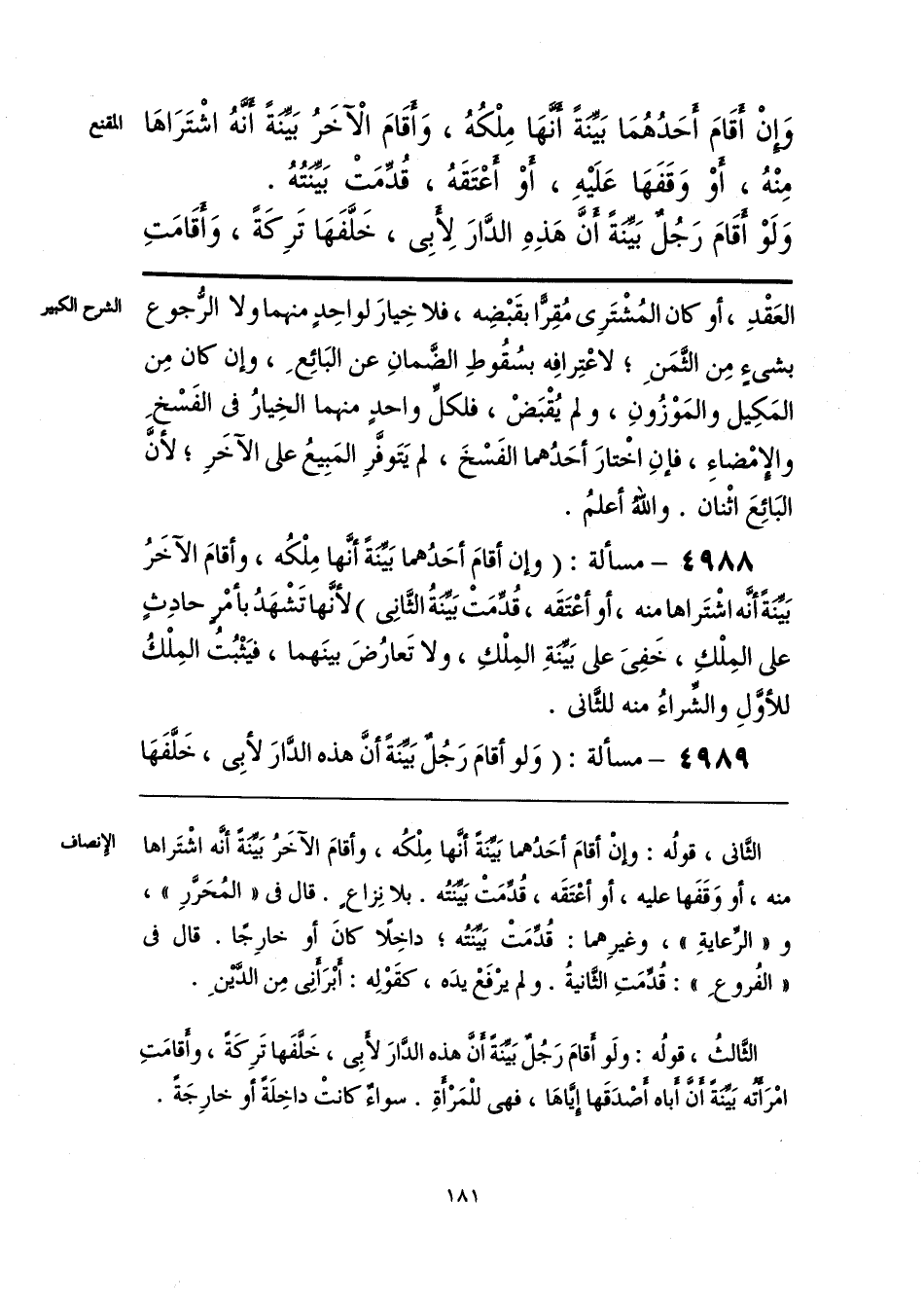 الثانى، قولُه: وإنْ أقامَ أحَدُهما بَيِّنَةً أنها مِلْكُه، وأقامَ الآخَرُ بَيِّنَةً أنَّه اشْتَراها منه، أو وَقَفَها عليه، أو أعْتَقَه، قُدِّمَتْ بَيِّنَتُه. بلا نِزاع. قال في «المُحَررِ»، و «الرِّعايةِ»، وغيرِهما: قُدِّمَتْ بَينتُه؛ داخِلًا كانَ أو خارِجًا. قال في «الفُروعِ»: قُامَتِ الثانيةُ. ولم يرْفَعْ يدَه، كقَوْلِه: أبْرَأنِي مِن الدَّيْنِ.