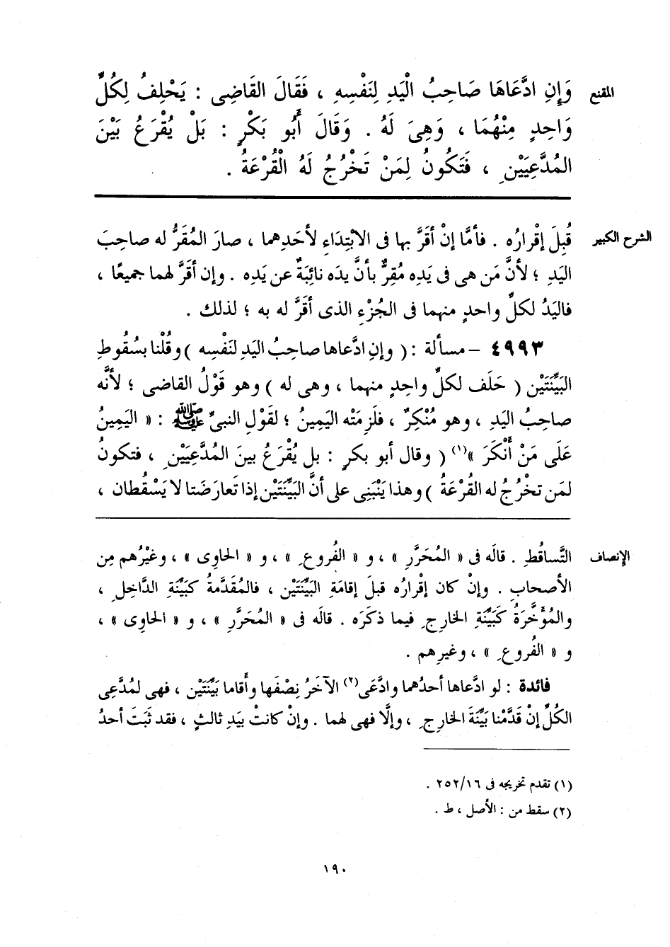 وَإِنِ ادَّعَاهَا صَاحِبُ الْيَدِ لِنَفْسِهِ، فَقَالَ القَاضِى: يَحْلِفُ لِكُلِّ وَاحِدٍ مِنْهُمَا، وَهِىَ لَهُ. وَقَالَ أَبُو بَكْرٍ: بَلْ يُقْرَعُ بَيْنَ المُدَّعِيَيْنِ، فَتَكُونُ لِمَنْ تَخْرُجُ لَهُ الْقُرْعَةُ.
