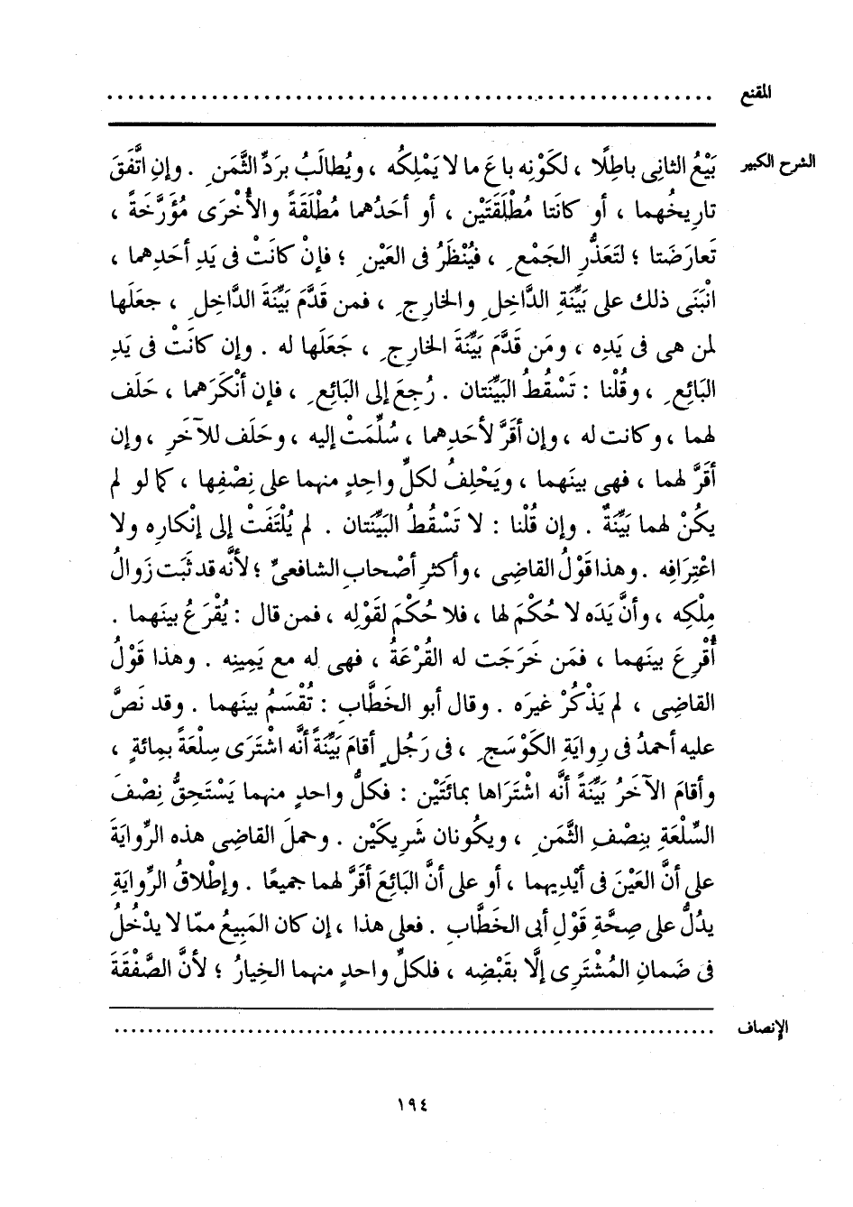 بَيْعُ الثانِى باطِلًا، لكَوْنِه باعَ ما لا يَمْلِكُه، ويُطالَبُ برَدِّ الثَّمَنِ. وإنِ اتَّفَقَ تارِيخُهما، أو كانَتا مُطْلَقَتَيْن، أو أحَدُهما مُطْلَقَةً وِالأُخْرَى مُؤَرَّخَةً، تَعارَضَتا؛ لتَعَذُّر الجَمْعِ، فيُنْظَرُ في العَيْنِ؛ فإنْ كانتْ في يَدِ أحَدِهما، انْبَنَى ذلك على بَيِّنَةِ الدَّاخِلِ والخارِجِ، فمن قَدَّمَ بَيِّنَةَ الدَّاخِلٍ، جعَلَها لمن هى في يَدِه، ومَن قَدَّمَ بَيِّنَةَ الخارِجِ، جَعَلَها له. وإن كانتْ في يَدِ البَائِعِ، وقُلْنا: تَسْقُطُ البَيِّنَتان. رُجِعَ إلى البَائِعِ، فإن أنْكَرَهما، حَلَف لهما، وكانت له، وإن أقَرَّ لأحَدِهما، سُلِّمَتْ إليه، وحَلَف للآخَرِ، وإن أقَرَّ لهما، فهى بينَهما، ويَحْلِفُ لكلِّ واحِدٍ منهما على نِصْفِها، كما لو لم يكُنْ لهما بَيِّنَة. وإن قُلْنا: لا تَسْقُطُ البَيِّنَتان. لم يُلْتَفَتْ إلى إنْكارِه ولا