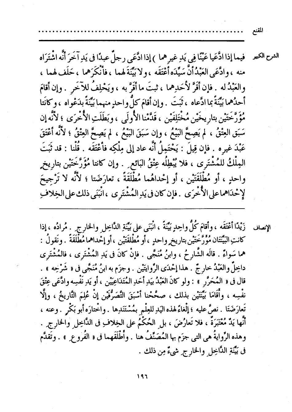 زَيْدًا أعْتَقَه، وأقامَ كُلُّ واحِدٍ بَيِّنَة، انْبَنَى على بَيِّنَةِ الدَّاخِلِ والخارِجِ. مُرادُه، إذا كانتِ البَيِّنَتَان مُؤرَّخَتَيْن بتاريخٍ واحدٍ، أو مُطْلقَتَيْن، أو إحْداهما مُطْلَقَةً. ونَقولُ: هما سَواءٌ. قالَه الشَّارِحُ، وابنُ مُنَجَّى. فإنْ كانَ فى يَدِ المُشْتَرِى، فالمُشْتَرِى داخِلٌ والعَبْدُ خارِجٌ. هذا إحْدَى الرِّوايتَيْن. وجزَم به ابنُ مُنَجَّىِ فى «شَرْحِه». قال فى «المُحَرَّرَ»: ولو كانَ العَبْدُ بيَدِ أحَدِ المُتَدَاعِيَيْن، أو يَدِ نفْسِه وادَّعى عِتْقَ نفْسِه، وأَقَامَا بَيِّنَتَيْن بذلك، صحَّحْنا أسْبَقَ التَّصَرُّفَيْن إنْ عُلِمَ التَّاريخُ، وإلَّا تَعارَضَتَا. نصَّ عليه؛ إلْغاءً لهذه اليَدِ للعِلْمِ بمُسْتَنَدِها. واخْتارَه أبو بَكْرٍ. وعنه، أنَّها يَدٌ مُعْتَبَرَةٌ، فلا تَعارُضَ، بلِ الحُكْمُ على الخِلافِ فى الدَّاخِلِ والخارِجِ.