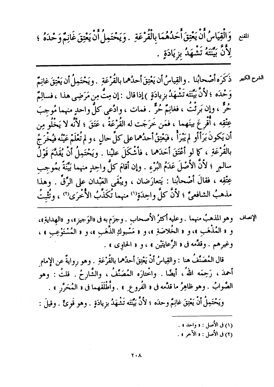 قال المُصَنِّفُ هنا: والقِياسُ أنْ يَعْتِقَ أحدُهما بالقُرْعَةِ. وهو رِوايةٌ عن الإِمامِ أحمدَ، رَحِمَه اللهُ، أيضًا. واخْتارَه المُصَنِّفُ، والشَّارِحُ. قلتُ: وهو الصَّوابُ. وهو ظاهِرُ ما قدَّمه فى «الفُروعِ». وأَطْلَقَهما فى «المُحَرَّرِ».