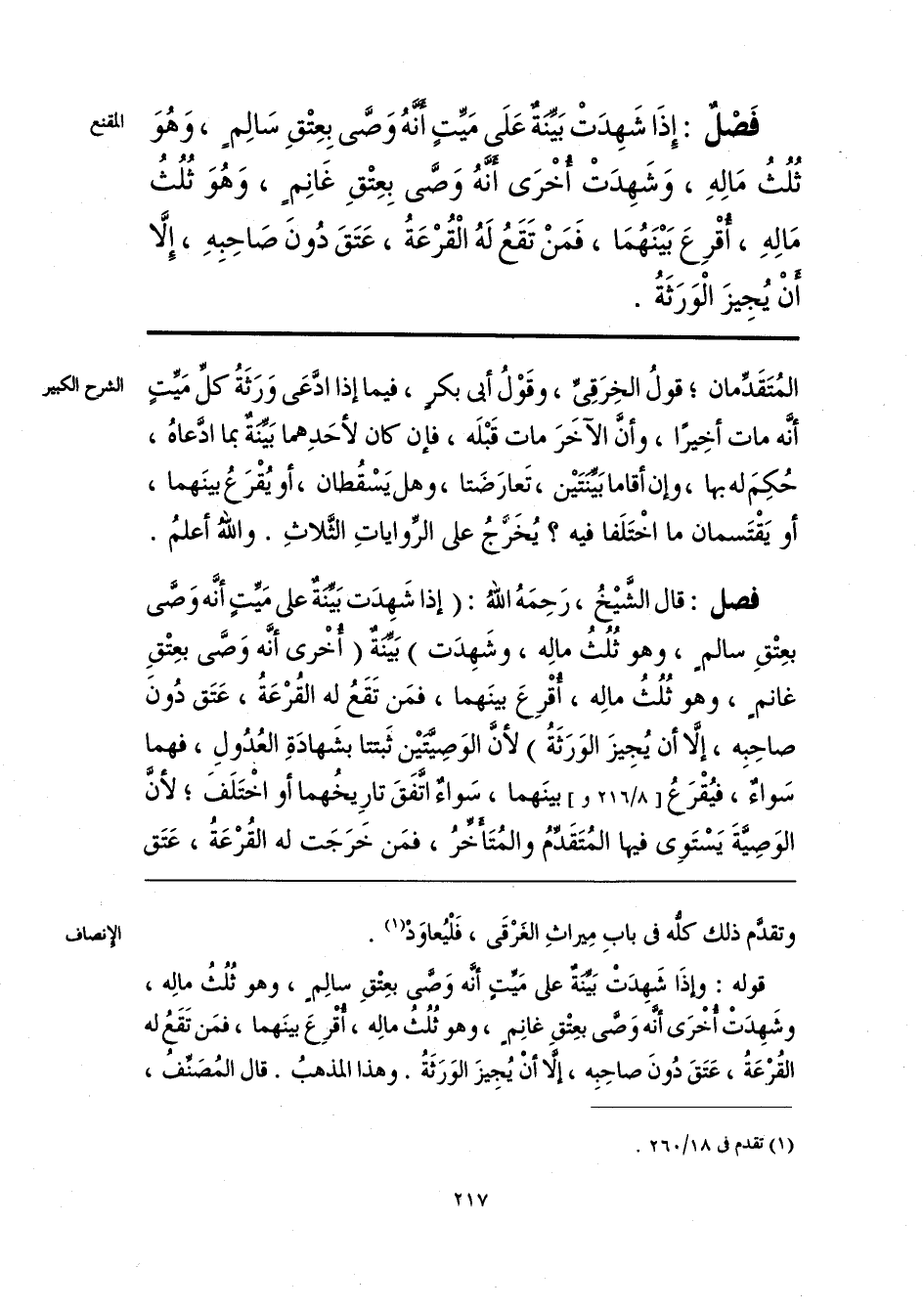 قوله: وإذَا شَهِدَتْ بَيِّنَةٌ على مَيِّتٍ أنَّه وَصَّى بعِتْقِ سالِمٍ، وهو ثُلُثُ مالِه، وشَهِدَتْ أُخْرَى أنَّه وَصَّى بعِتْقِ غانِمٍ، وهو ثُلُثُ مالِه، أُقْرِعَ بينَهما، فمَن تَقَعُ له القُرْعَةُ، عَتَقَ دُونَ صاحِبِه، إلَّا أنْ يُجِيزَ الوَرَثَةُ. وهذا المذهبُ. قال المُصَنِّفُ،