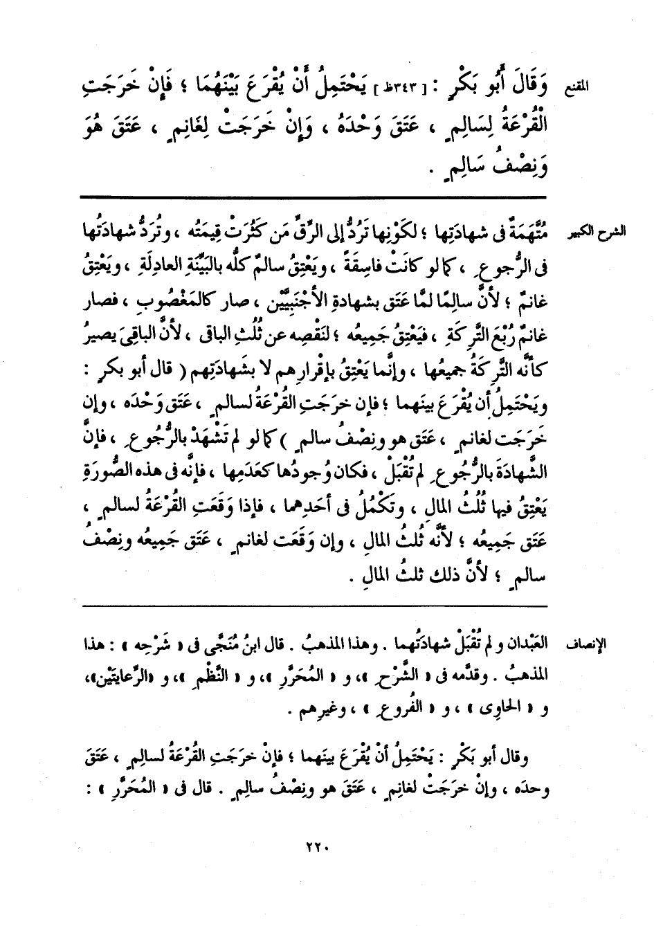 وقال أبو بَكرٍ: يَحْتَمِل أنْ يُقْرَعَ بينَهما؛ فإنْ خرَجَتِ القُرْعَةُ لسالِمٍ، عَتَقَ وحدَه، وإنْ خرَجَت لغانِمٍ، عَتَقَ هو ونِصْفُ سالِمٍ. قال فى «المُحَرَّرِ»: