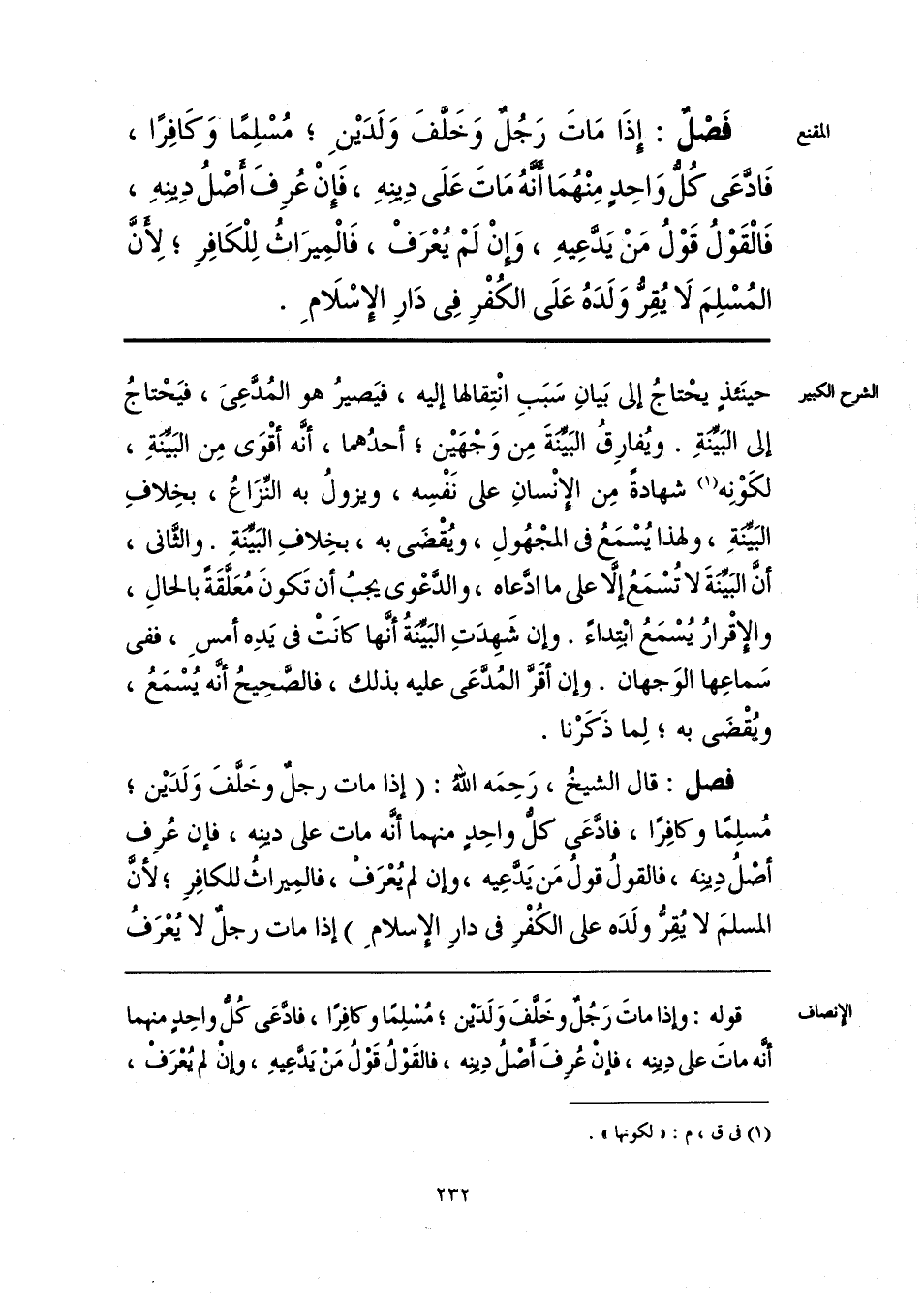 فَصْلٌ: إِذَا مَاتَ رَجُلٌ وَخَلَّفَ وَلَدَيْنِ؛ مُسْلِمًا وَكَافِرًا، فَادَّعَى كُلُّ وَاحِدٍ مِنْهُمَا أَنَّهُ مَاتَ عَلَى دِينِهِ، فَإِنْ عُرِفَ أَصْلُ دِينِهِ، فَالْقَوْلُ قَوْلُ مَنْ يَدَّعِيهِ، وَإِنْ لَمْ يُعْرَفْ، فَالْمِيرَاثُ لِلْكَافِرِ؛ لِأَنَّ المُسْلِمَ لَا يُقِرُّ وَلَدَهُ عَلَى الكُفْرِ فِى دَارِ الإِسْلَامِ.